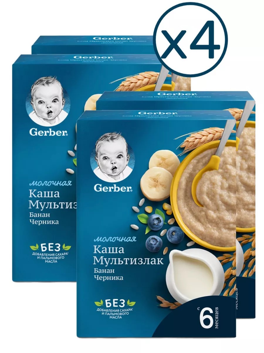 Молочная мультизлаковая каша GERBER с бананом и черникой для питания детей старше 6 месяцев согласно законодательству РФ.