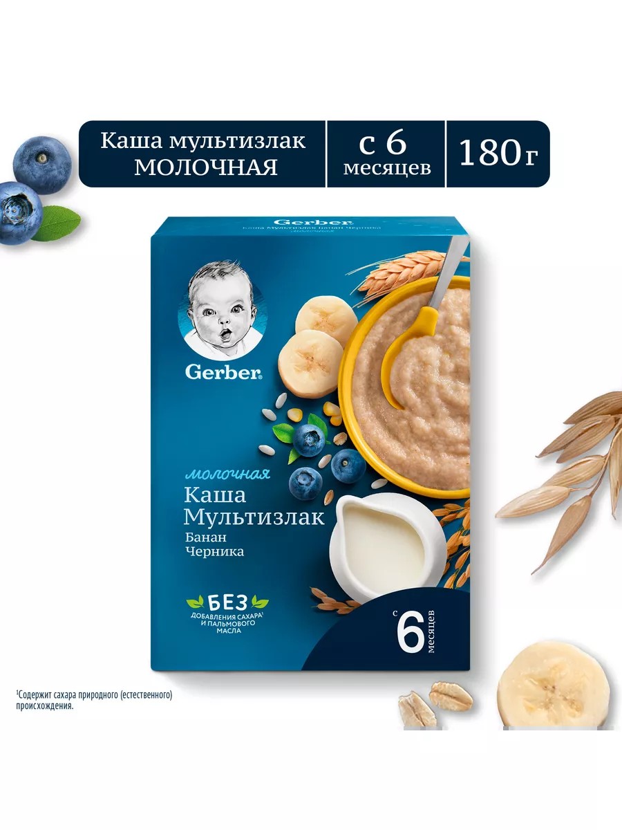 Молочная мультизлаковая каша GERBER с бананом и черникой для питания детей старше 6 месяцев согласно законодательству РФ.