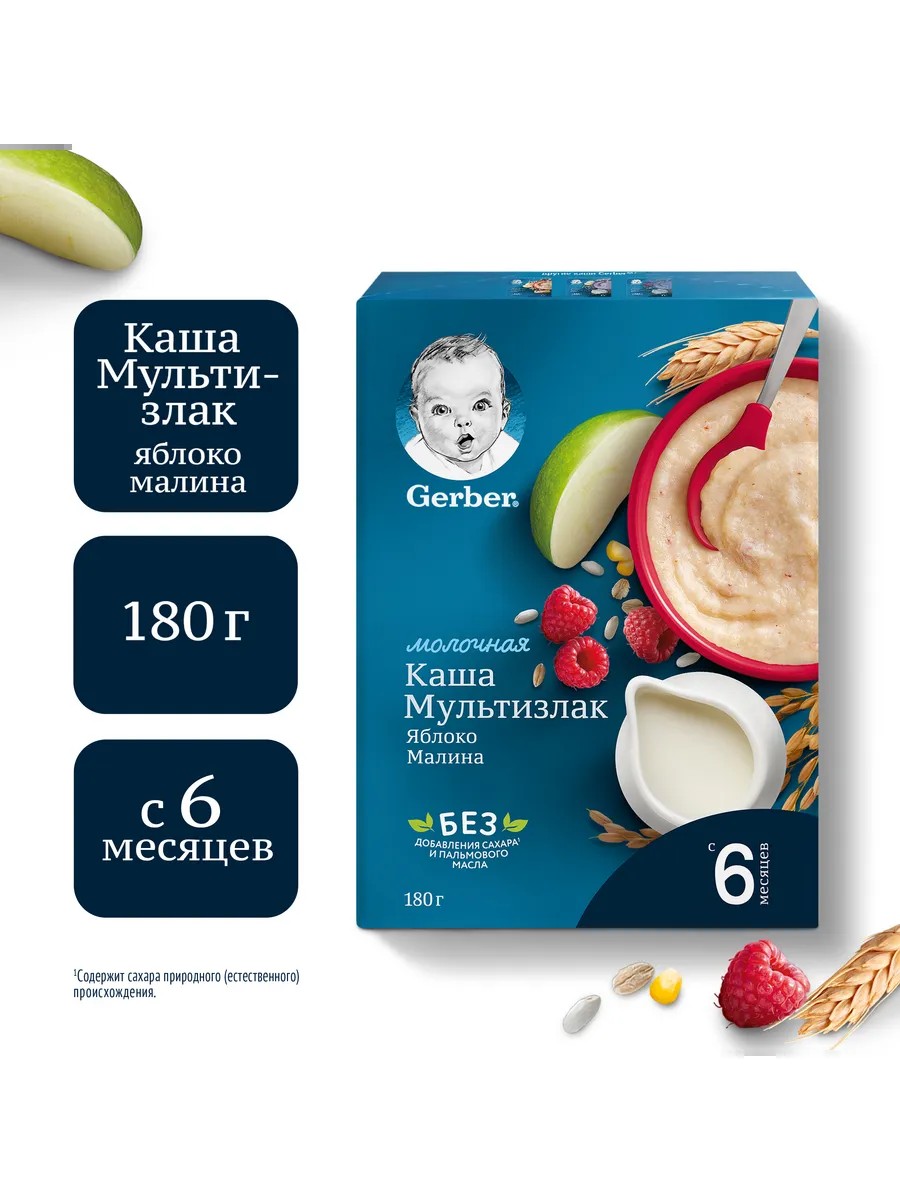 Каша Gerber молочная мультизлаковая с яблоком и малиной, с 6 мес, 180г. Гербер знает, что введение прикорма - особенное событие для вас и вашего малыша. Вы хотите, чтобы ваш малыш пробовал только лучшее. И мы тоже! Именно поэтому каши Gerber содержат только специально отобранные ингредиенты и ничего лишнего. Мы выстраиваем долгосрочные партнерские отношения с фермерами и поставщиками сырья, чтобы обеспечить максимально высокое качество фруктов и злаков.Мы добавляем в каши Gerber железо, так как этот элемент необходим для профилактики железодефицита и для полноценного физического и умственного развития.