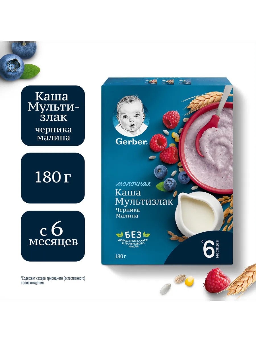 Каша Gerber молочная мультизлаковая с черникой и малиной, с 6 мес, 180г. Гербер знает, что введение прикорма - особенное событие для вас и вашего малыша. Вы хотите, чтобы ваш малыш пробовал только лучшее. И мы тоже! Именно поэтому каши Gerber содержат только специально отобранные ингредиенты и ничего лишнего.Мы выстраиваем долгосрочные партнерские отношения с фермерами и поставщиками сырья, чтобы обеспечить максимально высокое качество фруктов и злаков.Мы добавляем в каши Gerber железо, так как этот элемент необходим для профилактики железодефицита и для полноценного физического и умственного развития.