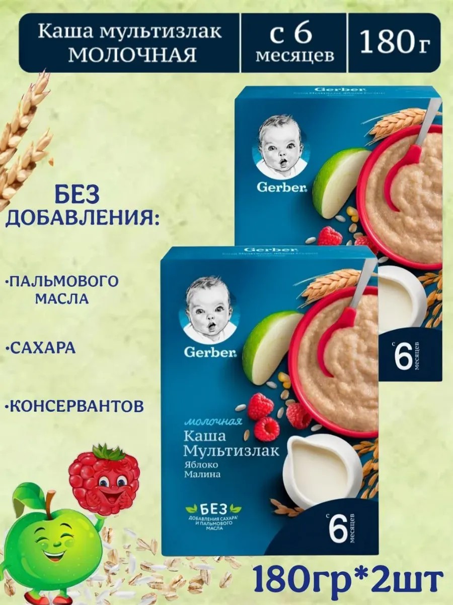 Каша молочная мультизлаковая яблоко-малина, 6 мес,180г,2шт