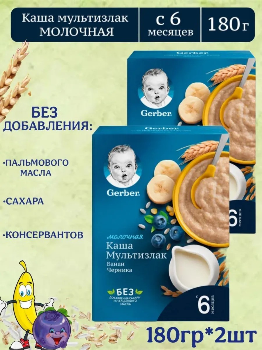 Каша молочная мультизлаковая банан-черника, 6 мес,180г,2шт