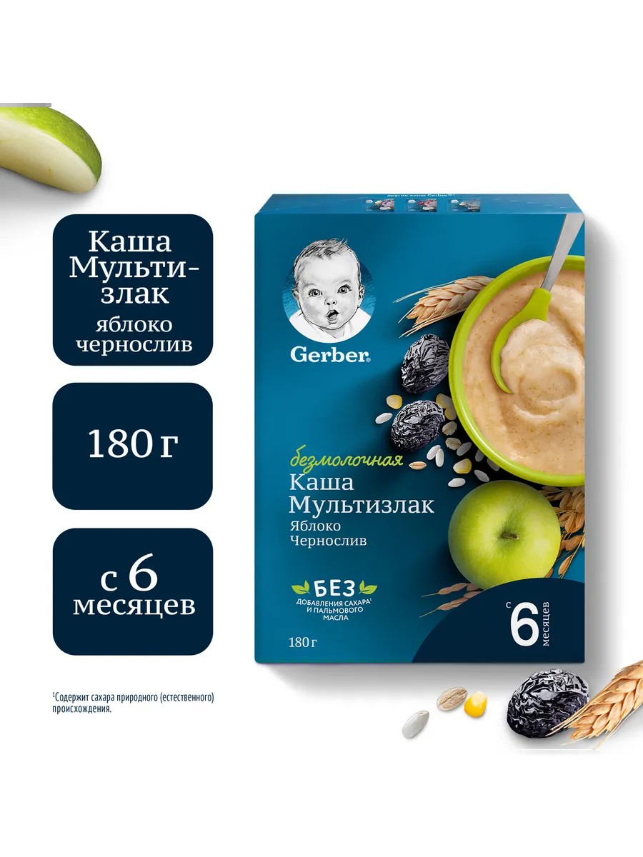 GERBER. Dairy-free multigrain cereal with apple and prunes, with bifidobacteria BL, from 6 months. 180g. Gerber knows that introducing solid foods is a special occasion for you and your baby. You want your baby to experience only the best. And so do we! That's why Gerber cereals contain only natural ingredients and nothing unnecessary. We build long-term partnerships with farmers and raw material suppliers to ensure the highest quality fruits and grains. We add iron to Gerber cereals, as this element is essential for the prevention of iron deficiency and for full physical and mental development. This product may contain milk. This product is packaged in a modified atmosphere with nitrogen.