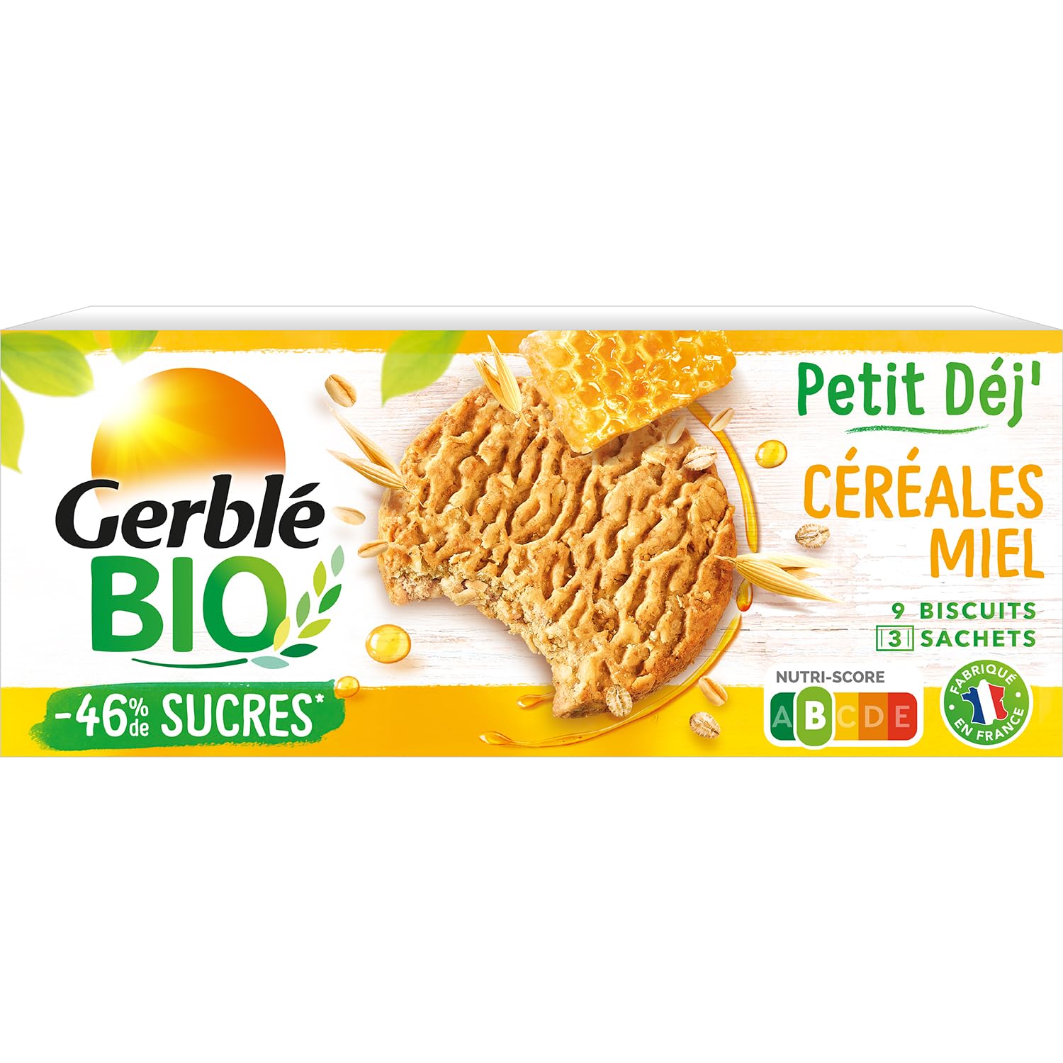 Discover our Breakfast Biscuit with Spelled and Honey Cereals. Made in France, this biscuit is made from ancient wheat, giving you a great start to the day! Ingredients: Oat flakes 31.6 , whole grain spelled flour (wheat) 23.8 , whole wheat flour from millstone 14.8 , oleic sunflower oil , cane sugar , chocolate chips 5.1 (cane sugar , cocoa mass 1, cocoa butter 1), low fat cocoa powder 1, natural banana flavor, baking powders (acid citric acid, sodium carbonates). Ingredients from organic farming 1Rainforest Alliance Certified Made in a workshop that uses nuts, lupine, milk, sesame and soy. INGREDIENTS OAT flakes 33 , whole grain spelled flour (WHEAT) 18.1 , whole wheat flour from millstone 16.2 , oleic sunflower oil , cane sugar , rice 5.3 , honey 5.3 , oats 0.5 , raising agents (citric acid, sodium carbonates), BARLEY malt syrup . Ingredients from from organic farming. Made in a workshop that uses NUTS, LUPINE, MILK, SESAME, SOY,Delivery contents: 1 x Pack of Gerblé Organic Spelt Breakfast Biscuits with Honey Cereals, 3 bags of 3 biscuits, Net weight: 132 g. Practical format: 3 individual bags of 3 biscuits, easy to take with you everywhere Keeps your biscuits fresh Recyclable cardboard packaging. Oat flakes, a source of fibre Palm oil free Colouring free Made in France. Nutriscore B: -46 in sugars and -76 in saturated fatty acids ( compared to the average biscuit on the market). Organic biscuits with spelt flour, cereals and honey, perfect for breakfast, children's snacks or coffee breaks. Découvrez notre Biscuit Petit Déj' à l'Épeautre et Céréales Miel. Fabriqué en France, ce biscuit est élaboré à partir de blé ancien, de quoi commence la journée du bon pied ! Ingrédients : Flocons d'avoine 31,6 , farine complète de grand épeautre (blé) 23,8 , farine complète de blé de meule 14,8 , huile de tournesol oléique , sucre de canne , pépites de chocolat 5,1 (sucre de canne , pâte de cacao 1, beurre de cacao 1), cacao maigre en poudre 1, arôme naturel de banane, poudres à lever (acide citrique, carbonates de sodium). Ingrédients issus de l'agriculture biologique 1Rainforest Alliance Certified Fabriqué dans un atelier qui utilise des fruits à coque, du lupin, du lait, du sésame et du soja. INGRÉDIENTS Flocons d'AVOINE 33 , farine complète de grand épeautre (BLE) 18,1 , farine complète de BLE de meule 16,2 , huile de tournesol oléique , sucre de canne , riz 5,3 , miel 5,3 , avoine 0,5 , poudres à lever (acide citrique, carbonates de sodium), sirop de malt d'ORGE . Ingrédients issus de l'agriculture biologique.Fabriqué dans un atelier qui utilise FRUITS A COQUE, LUPIN, LAIT, SESAME, SOJA,Contenu de la livraison : 1 x Paquet de Biscuits Petit Déj' Épeautre Céréales Miel Gerblé BIO, 3 sachets de 3 biscuits, Poids net : 132 g. Format pratique : 3 sachets individuels de 3 biscuits facile à emporter partout avec soi Conserve la fraîcheur de vos galettes Emballage en carton recyclable. Flocons d'avoine source de fibres Sans huile de palme Sans colorant Fabriqué en France. Nutriscore B : -46 en sucres et -76 en acides gras saturés ( par rapport à la moyenne des biscuits du marché). Biscuits bio à la farine d'épeautre, aux céréales et au miel, parfaits pour le petit-déjeuner, le goûter des enfants ou la pause-café.