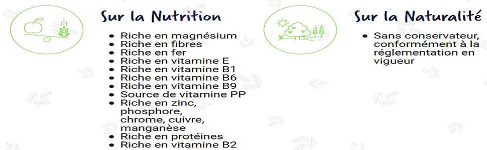 Notre Germe de Blé donne un bon goût céréalier à tous vos plats, salés comme sucrés, tout en vous apportant du magnésium, des protéines, ainsi que des vitamines E (antioxydantes), B1, B6, B9, et PP.