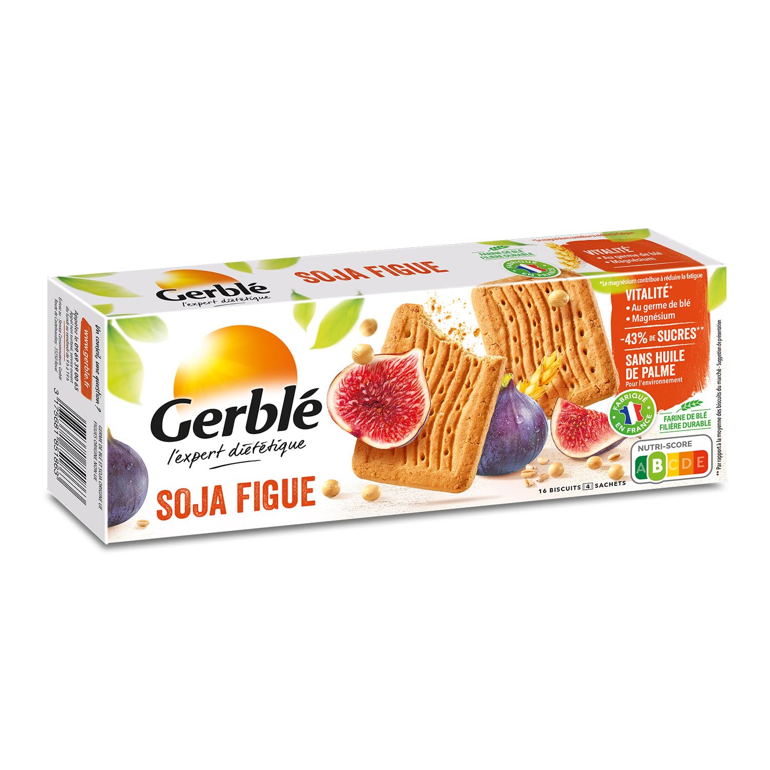 For 90 years, Gerblé has used all its know-how to offer you snacks combining pleasure and nutrition. To support you in your daily diet, we have chosen to display the nutri-score on all our packaging. Gerblé Vitalité biscuits with soy and fig flavor are perfect to accompany your tea or coffee for breakfast and for snacks during the day. These biscuits are both delicious and healthy: they contain 43 less sugar than the average biscuit on the market and are just as tasty. Thanks to Gerblé, treat yourself whenever you want! To be consumed as part of a varied, balanced diet and a healthy lifestyle. Store in a cool, dry place. INGREDIENTS WHEAT flour, brown cane sugar, rapeseed oil, whole wheat flour, SOYA flakes 10.4 , fig paste 7 , WHEAT germ 5.6 , WHEAT starch, emulsifier: rapeseed lecithins, magnesium, natural flavor, raising agents (citric acid, sodium carbonates), vitamins (E, PP, B5, B6, B1, B9) Made in a workshop that uses NUTS, MILK, SESAME, LUPINEContents: 1 x Gerblé Vitalité Fig Soy Biscuits Box, 4 bags of 4 biscuits, Weight: 270 g, 185186. Committed brand: French wheat flour from a 100 local and sustainable source, Recycled and recyclable cardboard box, Made in France. Palm oil free, Exclusively natural flavours, Biscuits rich in flavours ideal for children and adults. Nutriscore B, -43 sugar compared to the average biscuit on the market, Source of fibre and magnesium. Gourmet and fruity biscuits with a fig flavour and made from soy, Ideal as a snack at any time of the day thanks to its individual packaging. Depuis 90 ans, Gerblé emploie tout son savoir-faire pour vous proposer des encas alliant plaisir et nutrition. Pour vous accompagner dans votre alimentation au quotidien, nous avons choisi d'afficher le nutri-score sur tous nos emballages. Les biscuits Gerblé Vitalité au goût de soja et de figue sont parfaits pour accompagner votre thé ou votre café au petit-déjeuner et pour les petits creux durant la journée. Ces biscuits sont à la fois gourmands et sains : ils contiennent 43 de sucres en moins par rapport à la moyenne des biscuits du marché et sont tout aussi savoureux. Grâce à Gerblé, faites-vous plaisir quand vous voulez ! A consommer dans le cadre d'une alimentation variée, équilibrée et d'un mode de vie sain. A conserver dans un endroit frais et sec. INGRÉDIENTS Farine de BLE, sucre de canne roux, huile de colza, farine complète de BLE, flocons de SOJA 10,4 , pâte de figues 7 , germe de BLE 5,6 , amidon de BLE, émulsifiant : lécithines de colza, magnésium, arôme naturel, poudres à lever (acide citrique, carbonates de sodium), vitamines (E, PP, B5, B6, B1, B9) Fabriqué dans un atelier qui utilise FRUITS A COQUE, LAIT, SESAME, LUPINContenu : 1 x Boîte de Biscuits Soja Figue Vitalité Gerblé, 4 sachets de 4 biscuits, Poids : 270 g, 185186. Marque engagée : Farine de blé française filière 100 locale et durable, Boîte en carton recyclé et recyclable, Fabriqué en France. Sans huile de palme, Arômes exclusivement naturels, Biscuits riches en saveurs idéals pour les enfants et les adultes. Nutriscore B, -43 de sucre par rapport à la moyenne des biscuits du marché, Source de fibres et de magnésium. Biscuits gourmands et fruité au goût de figue et à base de soja, Idéal comme encas à n'importe quel moment de la journée grâce à ses emballages individuels.