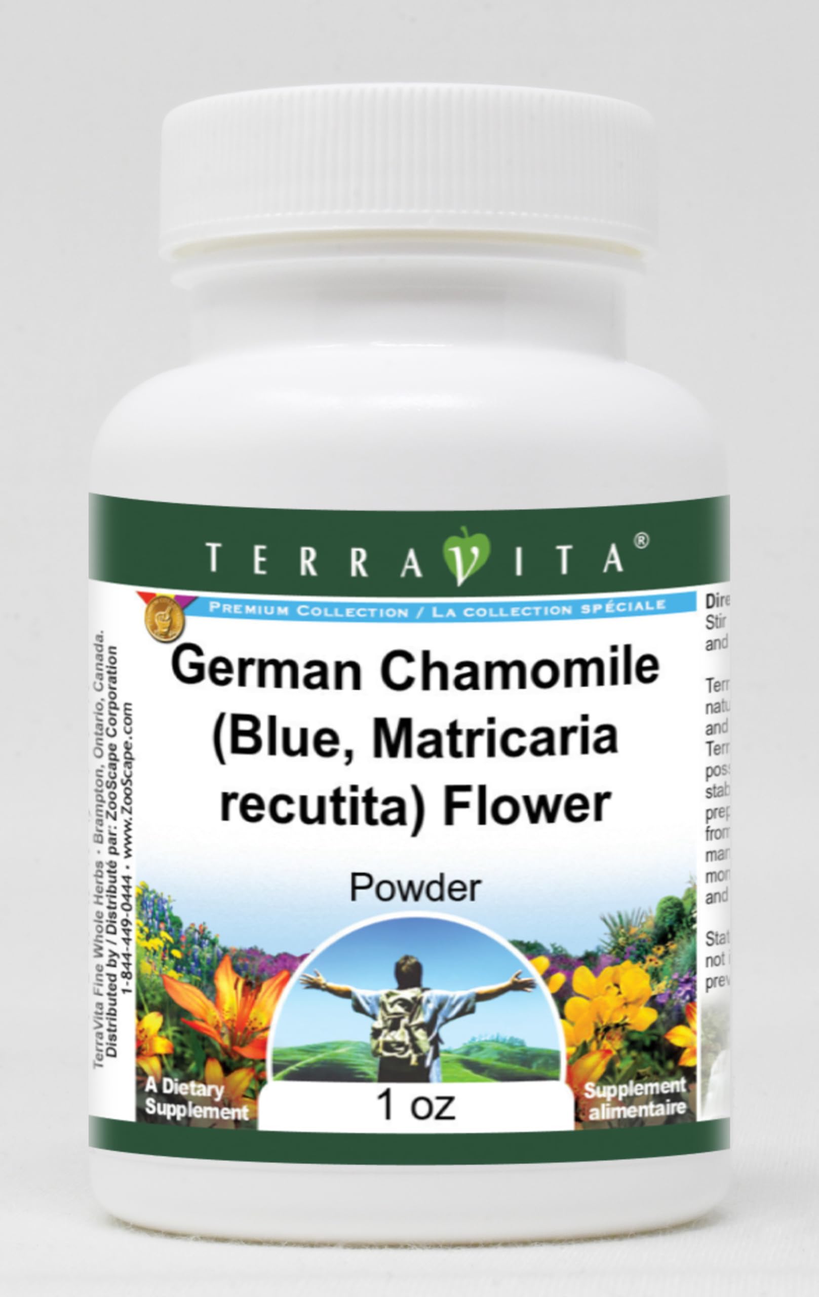 German Chamomile (Blue, Matricaria recutita) Flower Powder (1 oz, ZIN: 516215) Packaged in the United States in a GMP certified facility (Good Manufacturing Practice). No fillers. Manufacturer: TerraVita Size: 1 oz Convenient Powder format. Ingredients: Chamomile (German)