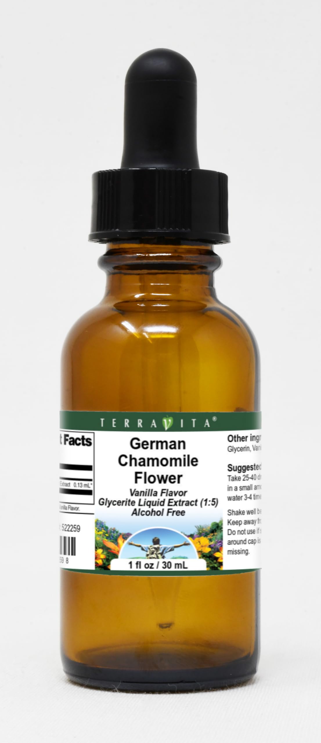 Convenient Liquid format. Size: 1 oz. Manufacturer: TerraVita. No fillers. German Chamomile Flower Glycerite Liquid Extract (1:5) - Vanilla Flavored (1 oz, ZIN: 522259).