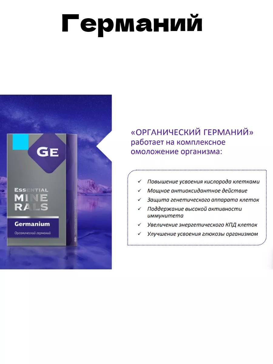 Уникальный сибирское комплекс с органическим германием, ресвератролом и природными антиоксидантами оказывает выраженное anti-age действие, антивозрастной эффект против старения, от морщин, комплексно омолаживает организм, замедляя процессы старения и насыщая ткани кислородом. Задерживает развитие опухолевых клеток! Рекомендован детям и взрослым с аутистическим расстройством. Активация генов долголетия. Ресвератрол - современный геропротектор для активной и яркой жизни. Поставьте время на паузу! Активируйте молодость, здоровье и энергию организма. Замедлить процессы старения - вполне реальная задача! Мощный антиоксидантный комплекс, компоненты которого участвуют в обменных процессах всех систем организма на клеточном уровне, обеспечивают его потребность в энергии и способствуют защите жизненно важных органов от внутренних повреждений и внешних воздействий.**Для кого?**Для всех, кто хочет сохранить молодость организма как можно дальше (возраст начала приема – 30 лет).