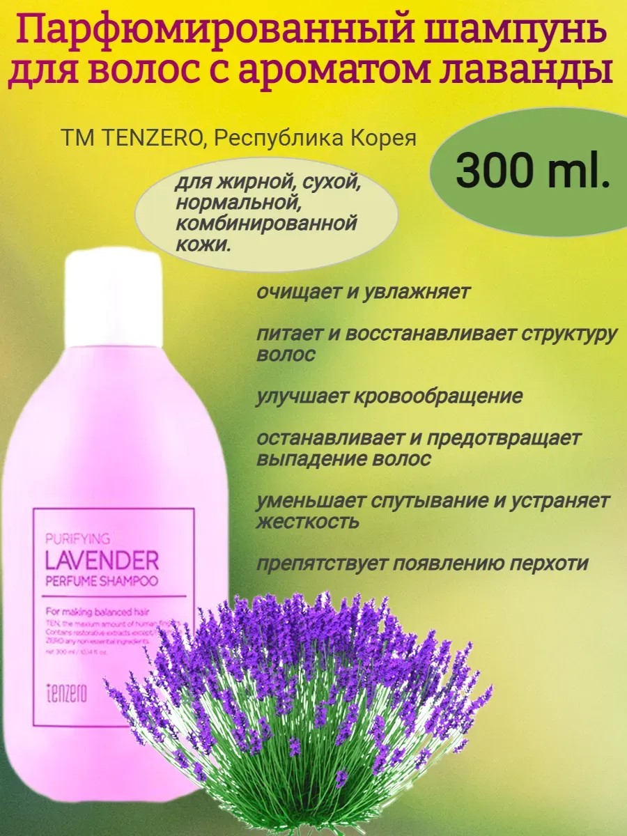 Парфюмированный шампунь с ароматом лаванды очищает скальп от загрязнений и себума, интенсивно увлажняет и разглаживает. Оставляет элегантный парфюмерный аромат на долгое время. Формула шампуня, богатая пептидами и растительными ингредиентами, поможет вернуть сухим и поврежденным волосам их естественное сияние, будет стимулировать рост волос, укреплять их корни и уменьшать выпадение, а также поможет разгладить волосы и сделать их устойчивыми к повреждениям. Для сухих и поврежденных волос. Способ применения: На влажные волосы нанесите необходимое количество шампуня, помассируйте несколько минут, тщательно смойте теплой водой. При необходимости повторите. Идеальный подарок женщине, маме, подруге, девушке любимой на день рождения, Новый год, 8 марта, день Святого Валентина. Рекомендуется к использованию в комплексе с серией косметики Tenzero.