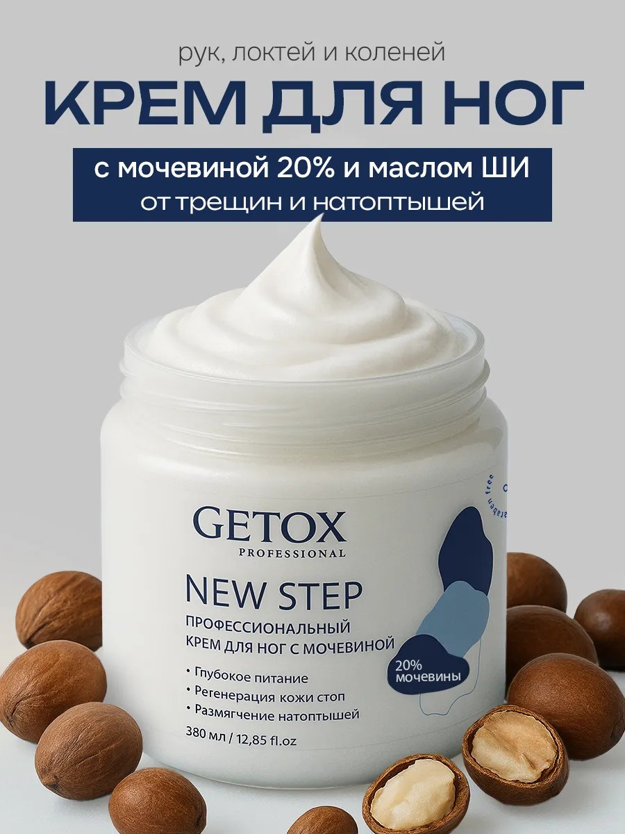 Увлажняющий крем для ног с мочевиной Getox помогает избавится от сухости, трещин и натоптышей. Средство восстанавливает кожу пяток, делая её мягкой и красивой. Качественный состав отлично смягчает и заживляет кожу ступней. Формула на основе мочевины, органических масел и активных компонентов подходит для любого типа кожи, включая сухую, жирную и комбинированную. Питательный крем с кератолитическим действием размягчает ороговевший слой, не раздражая и не травмируя кожу. Бережный "педикюрный" пилинг убирает все шелушения, кожа станет гладкой и эластичной, а ногти здоровыми. Высокая концентрация мочевины на уровне 20%, гораздо лучше обеспечивает глубокое увлажняющее действие и работает даже с огрубевшей кожей. Натуральное масло какао и витамины питают и повышают регенерацию тканей. Снимает усталость и ощущение тяжести в ногах. Крем от трещин на пятках подходит для ежедневного ухода за стопами, пятками, локтями и коленями. Не имеет резкого запаха, с натуральным составом. Идеально подходит как для профессионального использования, так и для ухода в домашних условиях.