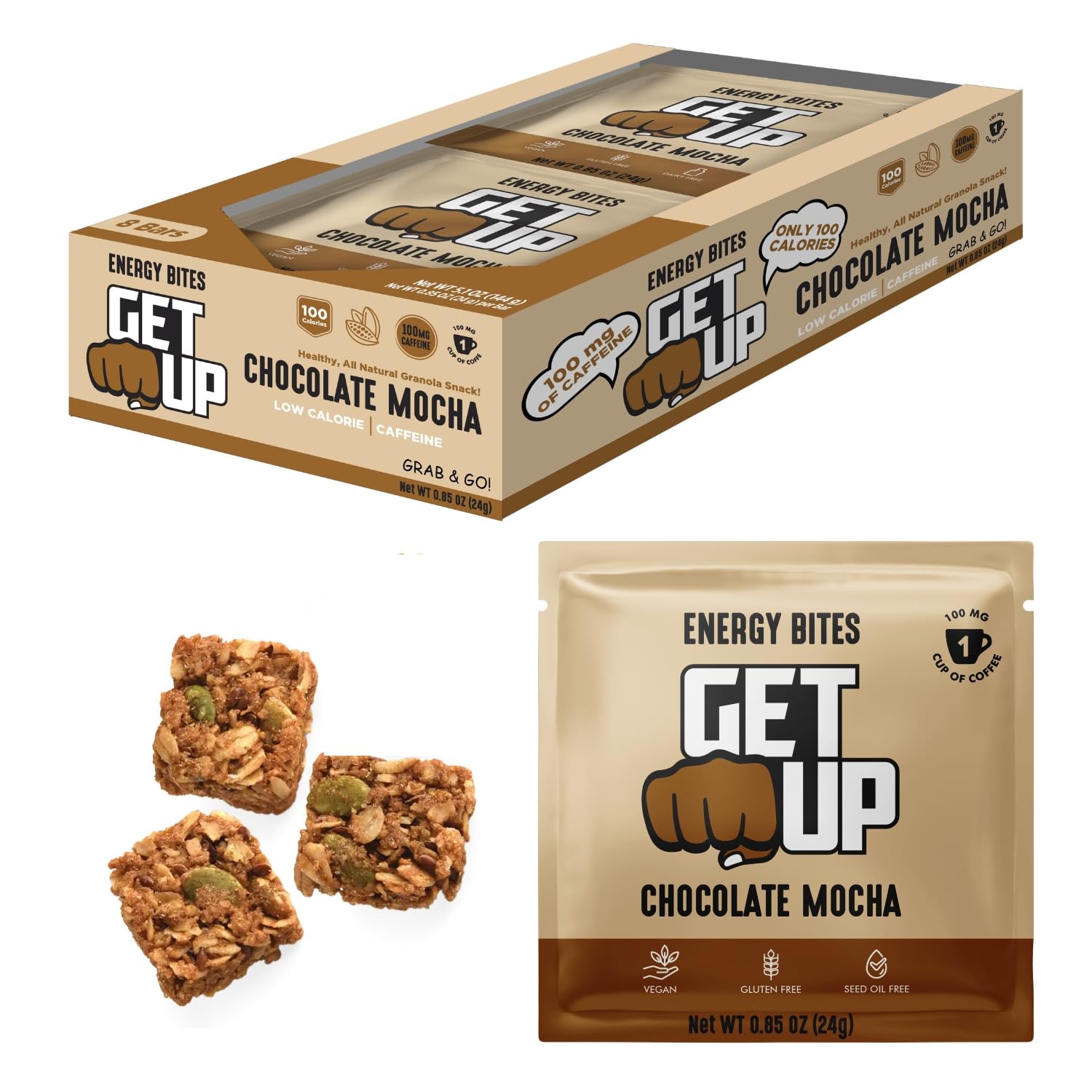 GetUp Caffeinated Granola Bites - Chocolate Mocha (10 Pack) 100mg Caffeine Energy Bites Low Calorie Gluten-Free 0 Seed Oils Pre-Workout Portable Snack Coffee Substitute - Low Sugar Energy Chocolate Mocha 1 Count