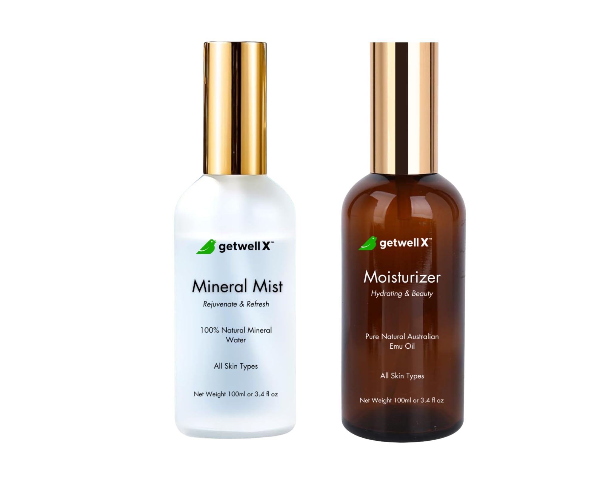 Elevate your skincare ritual with the Getwell X 2-step care kit—featuring a rejuvenating Mineral Mist sourced from natural hot springs and a deeply nourishing moisturizer made with 100 pure organic Australian emu oil. Step one delivers a refreshing mist packed with mineral-rich hydration to soothe and revitalize sensitive skin. Step two infuses your skin with omega-rich emu oil, offering deep moisture and skin-compatible fatty acids for lasting softness and resilience. Why they work beautifully together: Used regularly, it helps heal while enhancing the appearance of smooth, radiant, youthful-looking skin.