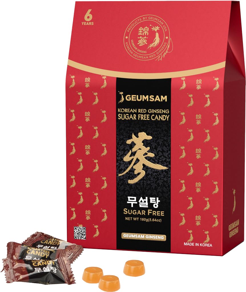 GEUMSAM Black Red Ginseng Sugar-Free Candy (160 g 5.64 oz) Enjoy the deep, authentic taste of premium Korean Black Red Ginseng in a convenient sugar-free hard candy. Made in Korea with carefully aged ginseng and clean sweeteners, this candy delivers a smooth herbal flavor without bitterness—perfect for daily enjoyment and natural wellness support. Key Features Benefits PREMIUM KOREAN GINSENG Crafted with authentic Korean Red Black Ginseng grown for over 4 years in the renowned Geumsan region. The traditional steaming and aging process enhances the depth and richness of the ginseng flavor. SUGAR-FREE FORMULA Sweetened with D-Maltitol to deliver sugar-like sweetness with fewer calories and a low-glycemic impact. A great choice for anyone seeking sugar-free snacks or following low-carb or keto-friendly lifestyles. NATURAL DAILY SUPPORT Each candy contains Red Black Ginseng extract that provides a gentle herbal boost—ideal for everyday use at home, work, or on the go. SMOOTH, DEEP GINSENG FLAVOR Balanced to highlight the true taste of Korean ginseng without bitterness. A pleasant and enjoyable herbal candy intended for adults. MADE IN KOREA – PREMIUM QUALITY Beautifully packaged, making it a thoughtful and health-focused gift. Ingredients Information Net Weight: 160 g (5.64 oz) per pack Ingredients: Maltitol syrup, Vegetable oil (hardened palm oil), Black red ginseng concentrate (solids 60 or more red ginseng concentrate 90 , black ginseng concentrate 10 , domestic), Flavor (red ginseng flavor), Emulsifier, L-menthol. Ginseng Ingredients: Black and Red Ginseng Extract (Solid Content 60 or more, Made in Korea) 100 . Suggested Use Enjoy up to 6 candies per day as needed. Note: Excessive consumption of Maltitol may have a laxative effect.