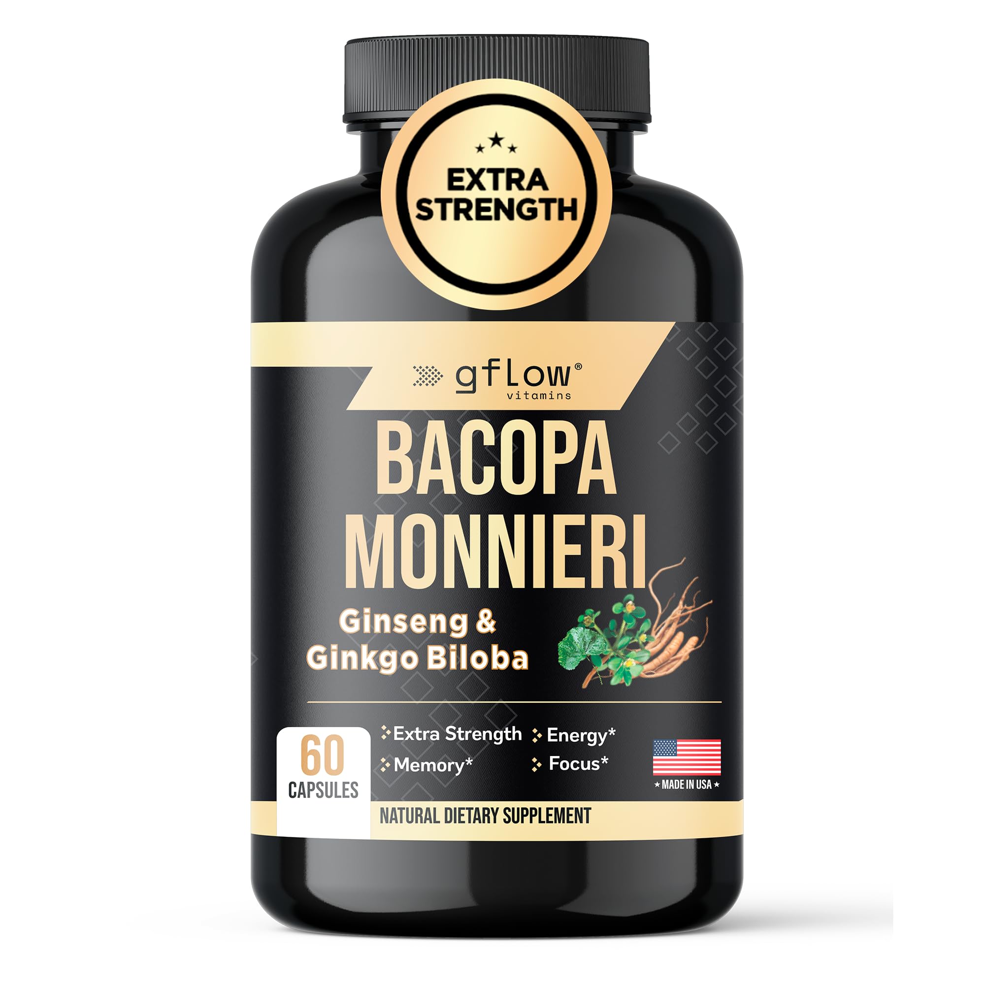 gflow vitamins Bacopa Monnieri Supplement with Ginseng and Ginkgo Biloba | Made in The USA | 60 Capsules, 30 Servings