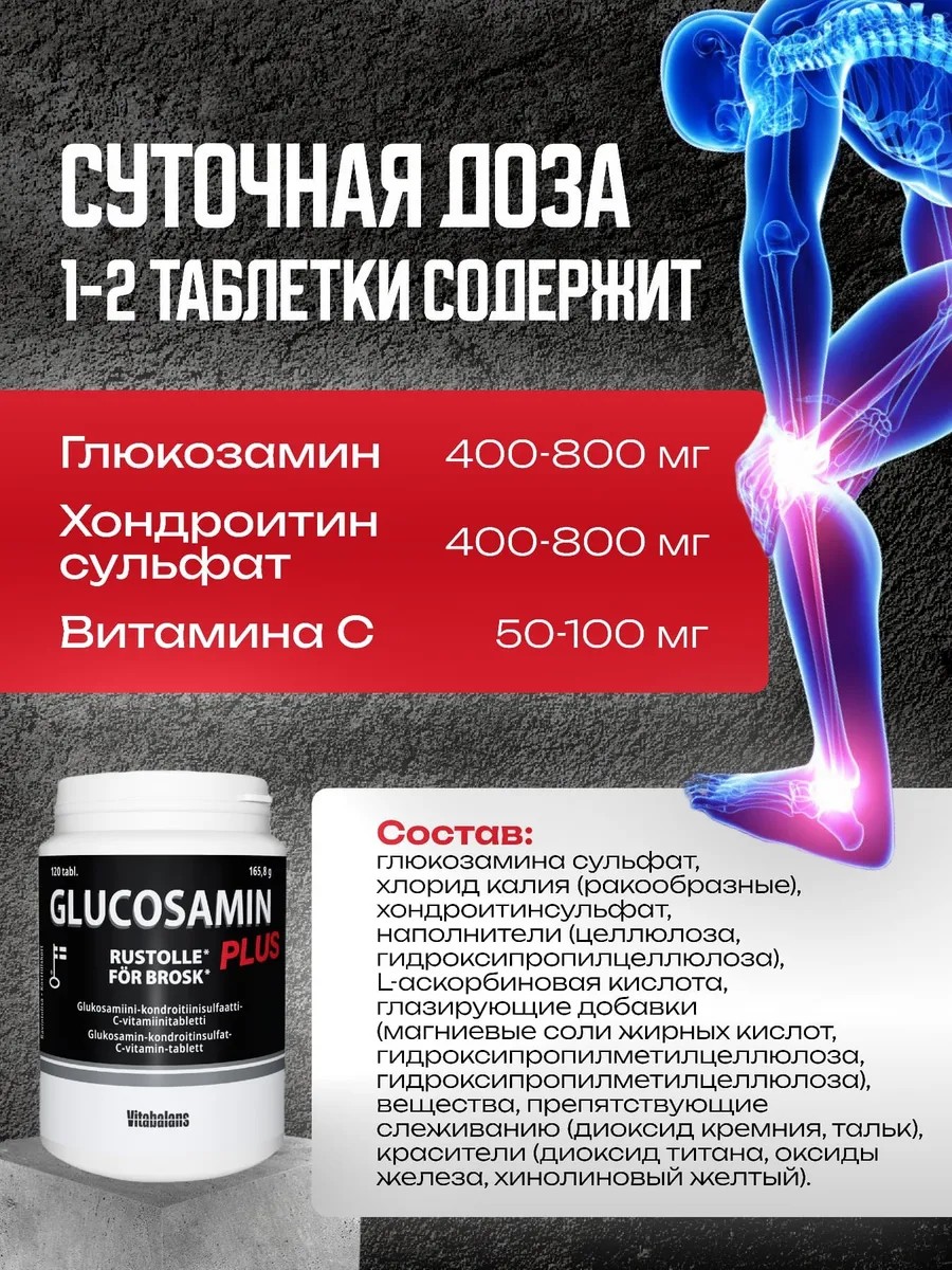 Дозировка: взрослым 1-2 таблетки в день, запивая водой. Содержание на 1-2 таблетки: Глюкозамин - 400-800 мг Хондроитин - 400-800 мг Витамин C 50-100 мг
