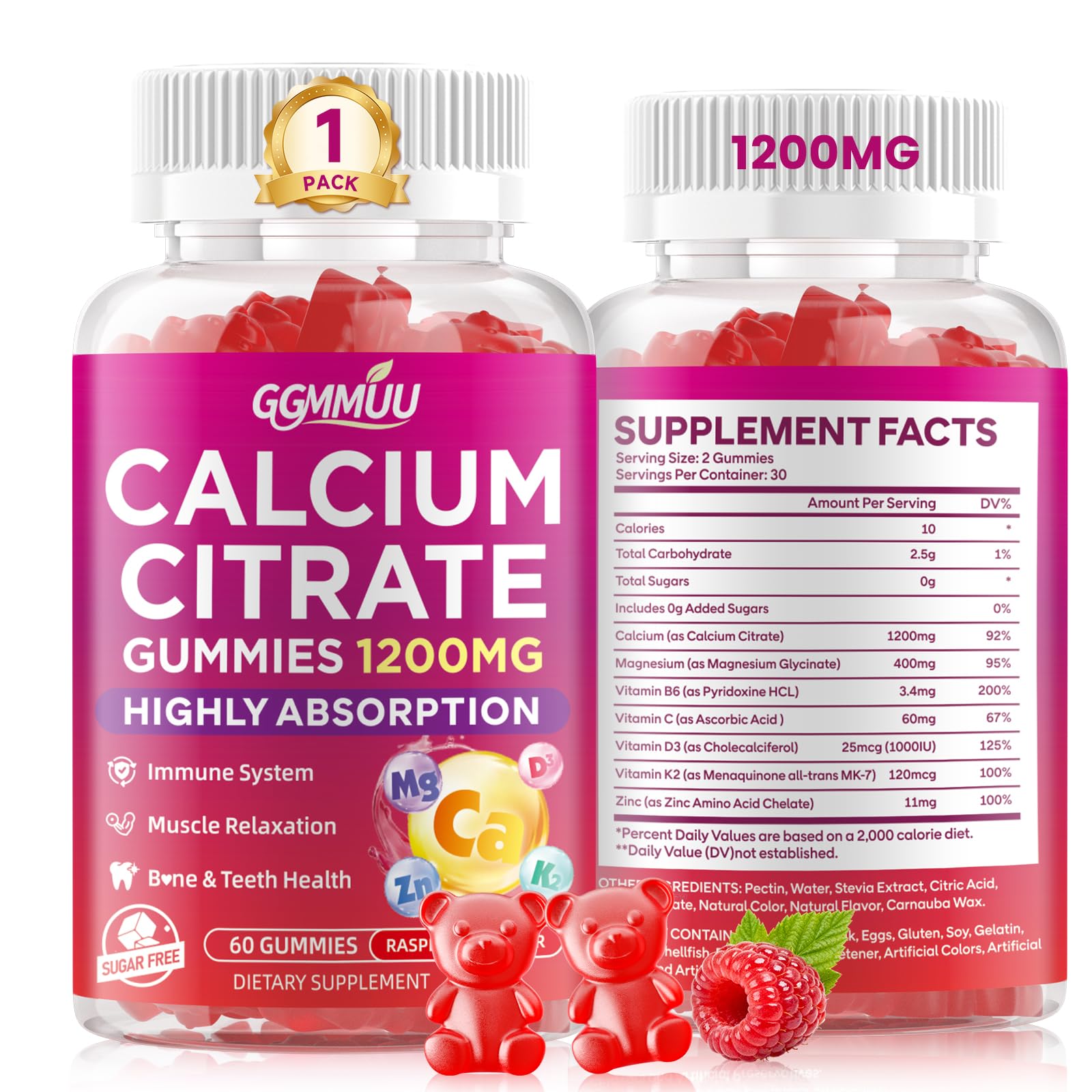Sugar-free Gummies - Our calcium supplements for kids adults are non-GMO, gluten-free, free from artificial colors, flavors, and preservatives, vegan-friendly and crafted with natural ingredients. Each bottle contains 60 calcium magnesium gummies, providing a full 30 days supply. 2 gummies a day will easily meet your daily calcium needs and promote overall health. Make this simple supplement a seamless healthy habit. Convenient and Tasty - Our chewable calcium citrate offer a natural raspberry flavored that makes it easy to incorporate into your daily routine. Non-sticky, non-bitter. Compared with capsules and powders that are difficult to swallow every day, the delicious gummies with calcium, magnesium, zinc and a variety of natural vitamins are easier to accept and perfect for home, office, or travel. Overall Wellness - Calcium is one of the most abundant minerals in the human body and plays a crucial role in numerous physiological processes. On the other hand, magnesium aids in nutrient transport and muscle function, while Zinc provides crucial support for the body's natural immune defenses. Whether you're looking for calcium supplements to b0ne heath, teeth muscle health, or simply ensure optimal calcium intake, these gummies offer a tasty and effective solution to support overall body health. High-Absorption Calcium Citrate with Vitamin D3 - This calcium citrate supplements formulation is synergistically combined with vitamin D3 and K2 to facilitate efficient calcium absorption and bioactive utilization. With 1000 IU of Vitamin D3 to promote systemic calcium bioavailability, and Vitamin K2 (as MK-7) to support targeted calcium integration into b0ne matrix, dental structures, and muscular tissues—thereby minimizing accumulating in soft tissues, This synergistic blend is designed to maintain healthy teeth and muscle function. Calcium Citrate 1200mg - GGMMUU calcium citrate gummies deliver a potent 1,200 mg of calcium per serving, can offer optimized absorption and bioavailability, ensuring that your body can efficiently absorb and utilize the essential calcium it needs, helping to support energy and maintain a healthy immune system.