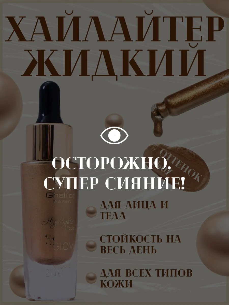 Подарите своему лицу невероятное сияние с жидким хайлайтером Сияние Ghalior LIQUID GLOW. Этот уникальный продукт станет незаменимым элементом в вашей косметичке, позволяя создать идеальный макияж для любого случая.