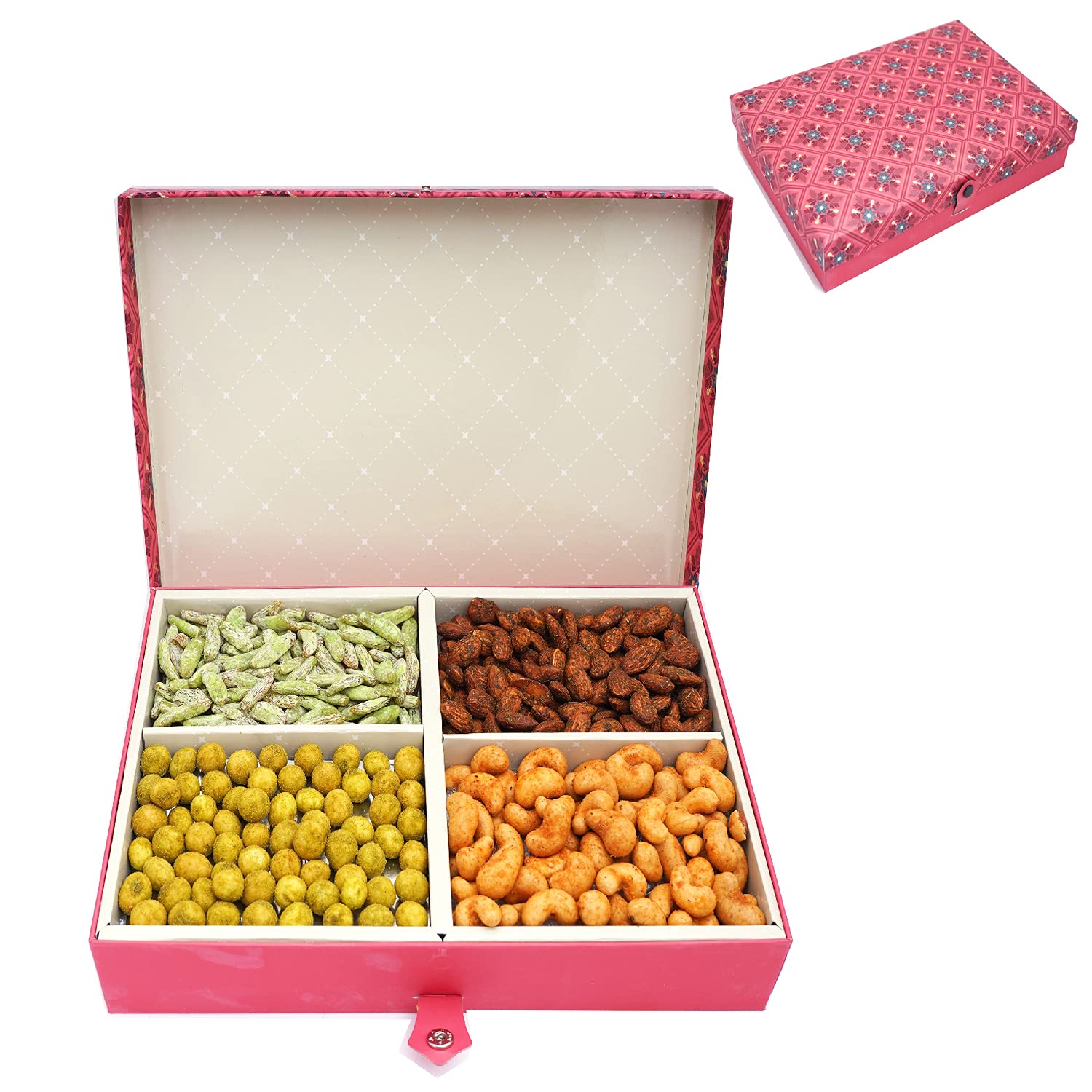Ghasitaram Gifts Diwali Gifts Red 4 Part Flavoured Nuts Box 600 GMS