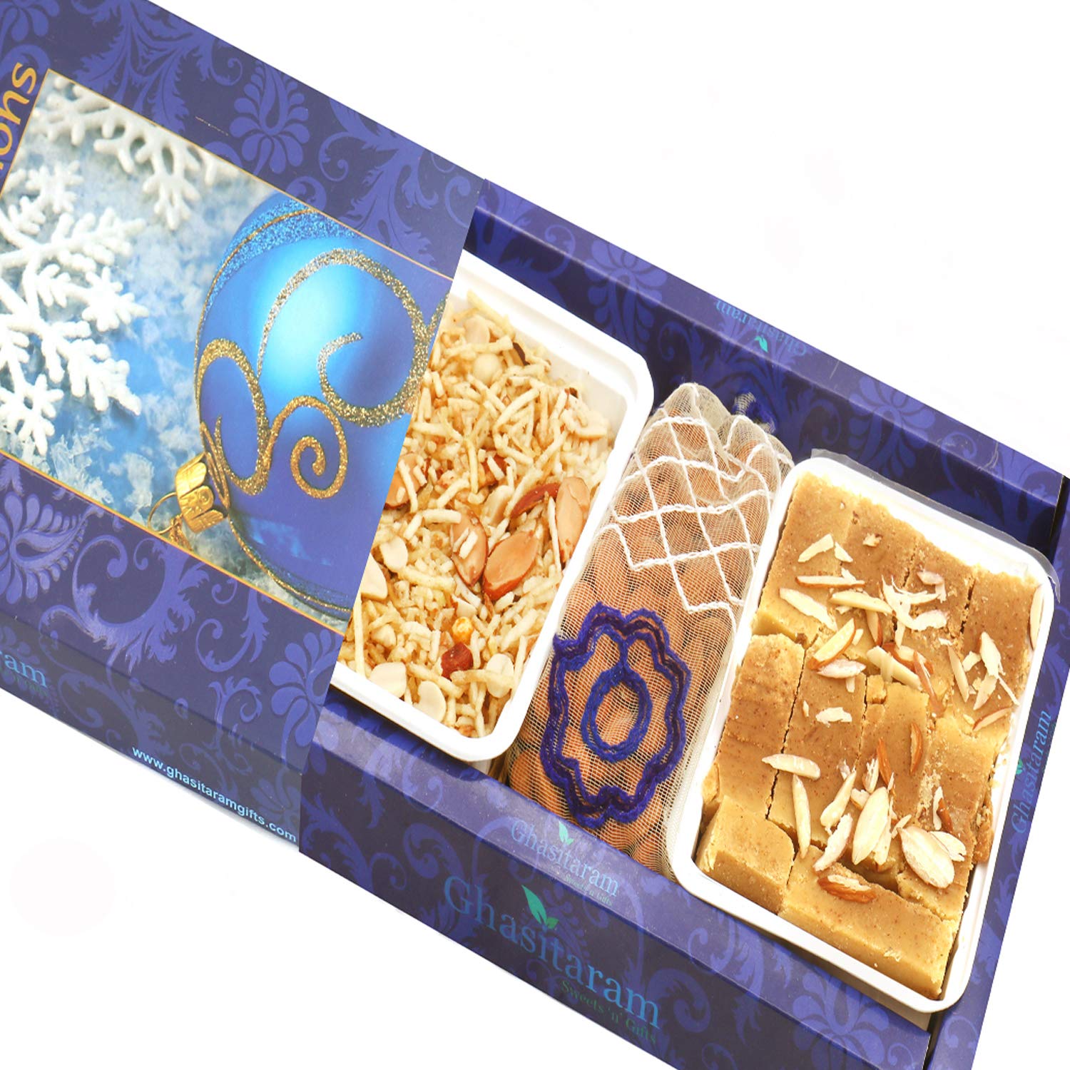 Try this sweet and salty hamper comprising of a box of Soft Mysore Pak sweets (200 gms), Namkeen Faradi Chiwda (200 gms) and a Pouch of Almonds (100 gms). Net weight: 500gms.This mithai has been specially packed using Italian technology for an extended shelflife.