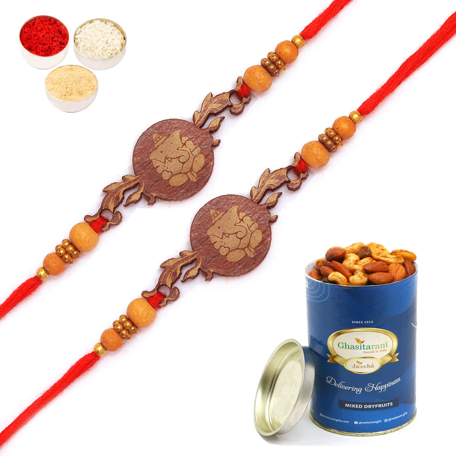 Ghasitaram Gifts Rakhi for Brother Rakhis Online - Set of 2 - BW-5414 Wooden Ganesha Rakhi with 100 GMS of Dryfruits Mix Can 2 Rakhi with 100 gms of Dryfruits Mix Can