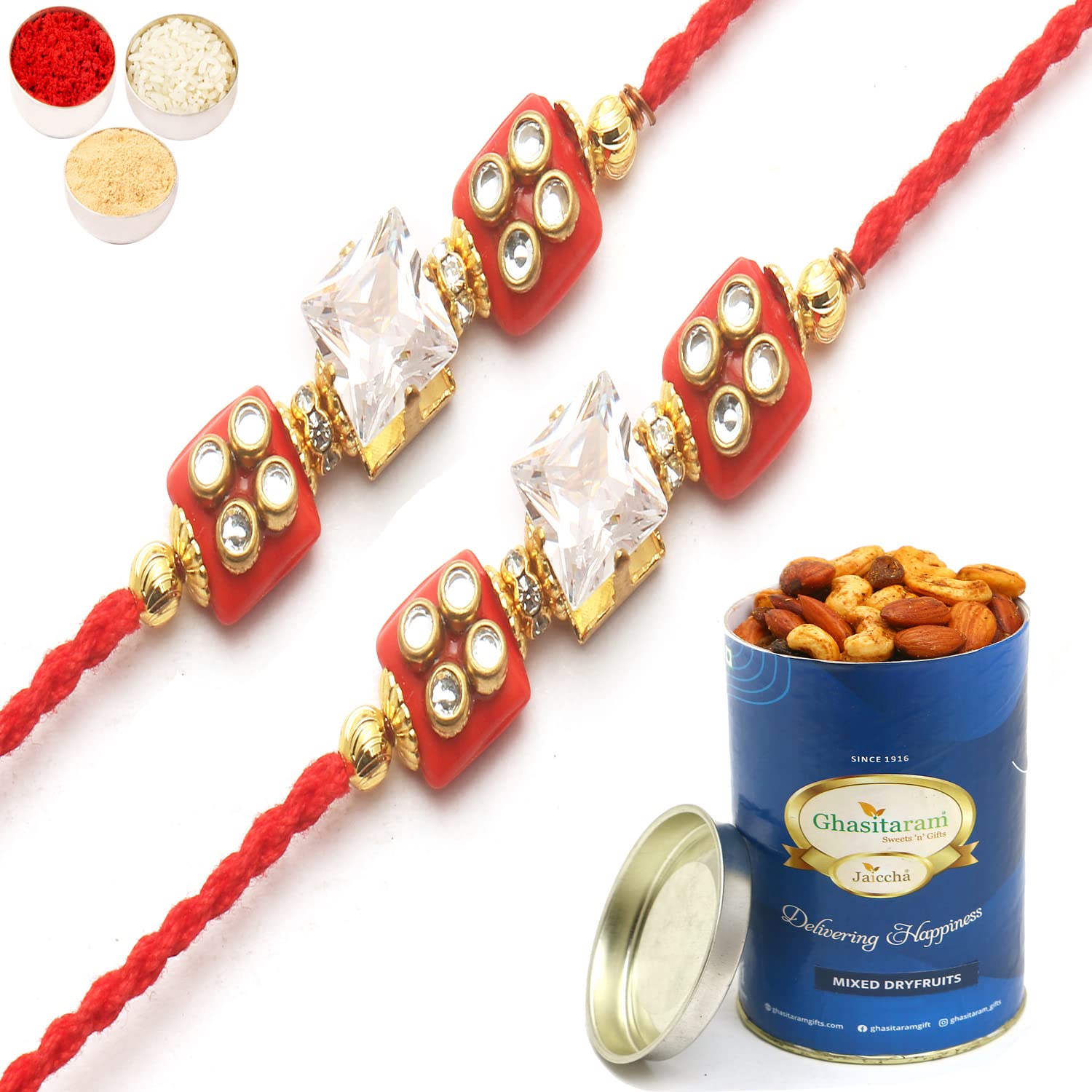 Ghasitaram Gifts Rakhi for Brother Rakhis Online - Set of 2 d209 Diamond Rakhi with 100 GMS of Dryfruits Mix Can 2 Rakhi with 100 gms of Dryfruits Mix Can