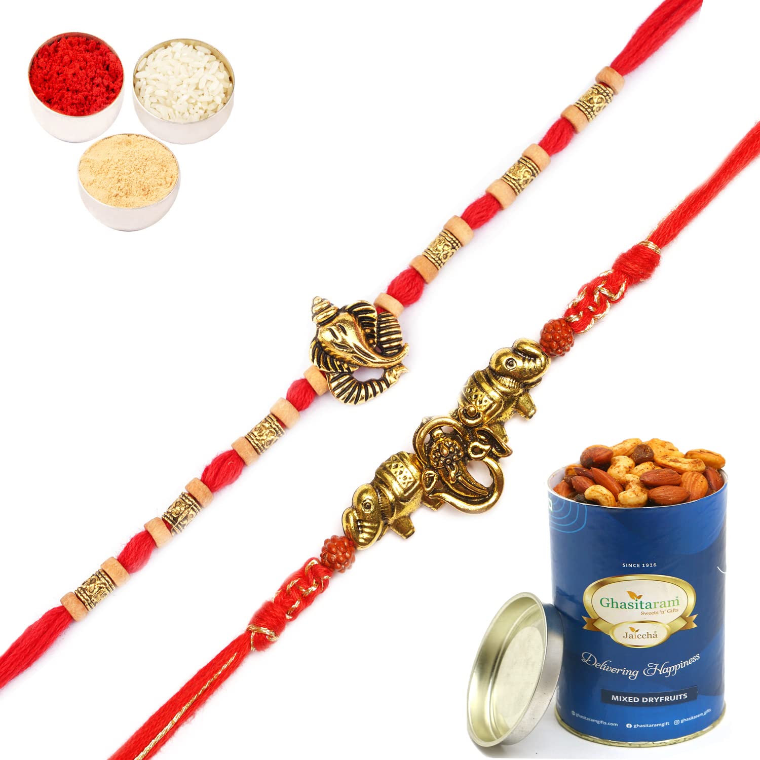 Ghasitaram Gifts Rakhi for Brother Rakhis Online - Set of 2 LD-9923 and LD-84 Om Ganesh Divine Rakhis with 100 GMS of Dryfruits Mix Can