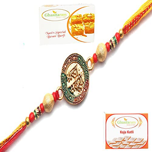 Ghasitaram Gifts Rakhi for Brother Rakhis Online - Shraddha & Saburi for My Brother Rakhi with 200 GMS of Besan Barfi and 200 GMS of Kaju Katli Rakhi Set with 200 gms of Besan Barfi & Kaju Katli
