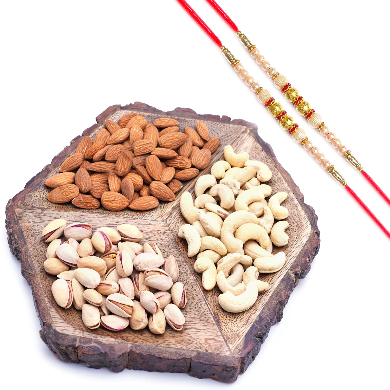 Ghasitaram Gifts Rakhi Gifts for Brothers Dryfruit - Hexagon Log Platter with Dryfruits with 2 Pearl Rakhis