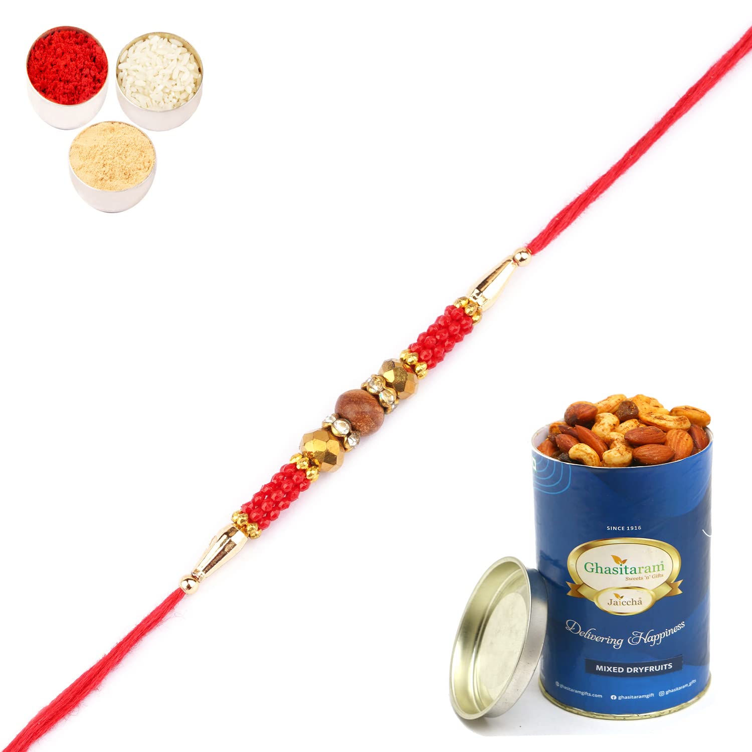 Ghasitaram Gifts Rakhis Online for Brother- Nbh-226 Rakhi Thread with 100 GMS of Dryfruits Mix Can Rakhi Set with 100 gms of Dryfruits Mix Can