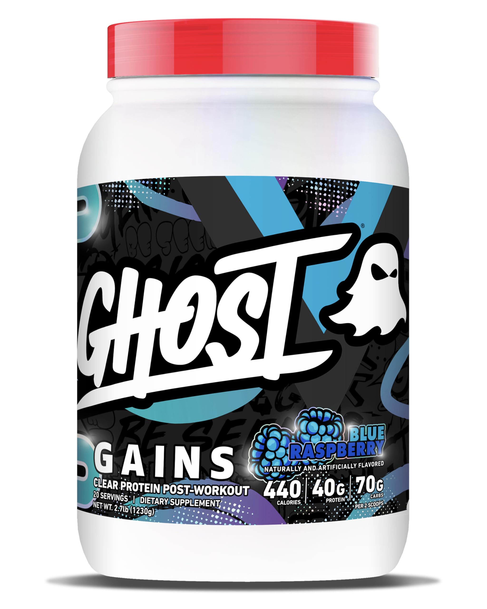 Be Seen: As a premium active lifestyle brand, GHOST is powering and empowering users to Be Seen beyond the walls of the gym. The name GHOST and mantra "Be Seen" come from that feeling of being behind the scenes and wanting to be heard, waiting to make an impact. We're all Ghosts. This is our time. Total Transparency: All GHOST products feature a transparent label that fully discloses the dose of each active ingredient. Zero proprietary blends means you know what you're getting in each and every scoop. Zero Fat. No Added Sugar.: The Clear Gains formula is fat and sugar free for easy sips. Plus, it's gluten and soy free with no amino spiking. Post-Workout Gains: Bulk up with 40G of Whey Protein Isolate, 70G of Vitargo, and 440 Calories for performance recovery support (per 2-scoop serving.). Light. Refreshing. Legendary.: Introducing GHOST Clear Gains—the industry's first clear performance gainer. Blue Raspberry flavor. 10 2 scoop servings 20 single scoop servings per container.