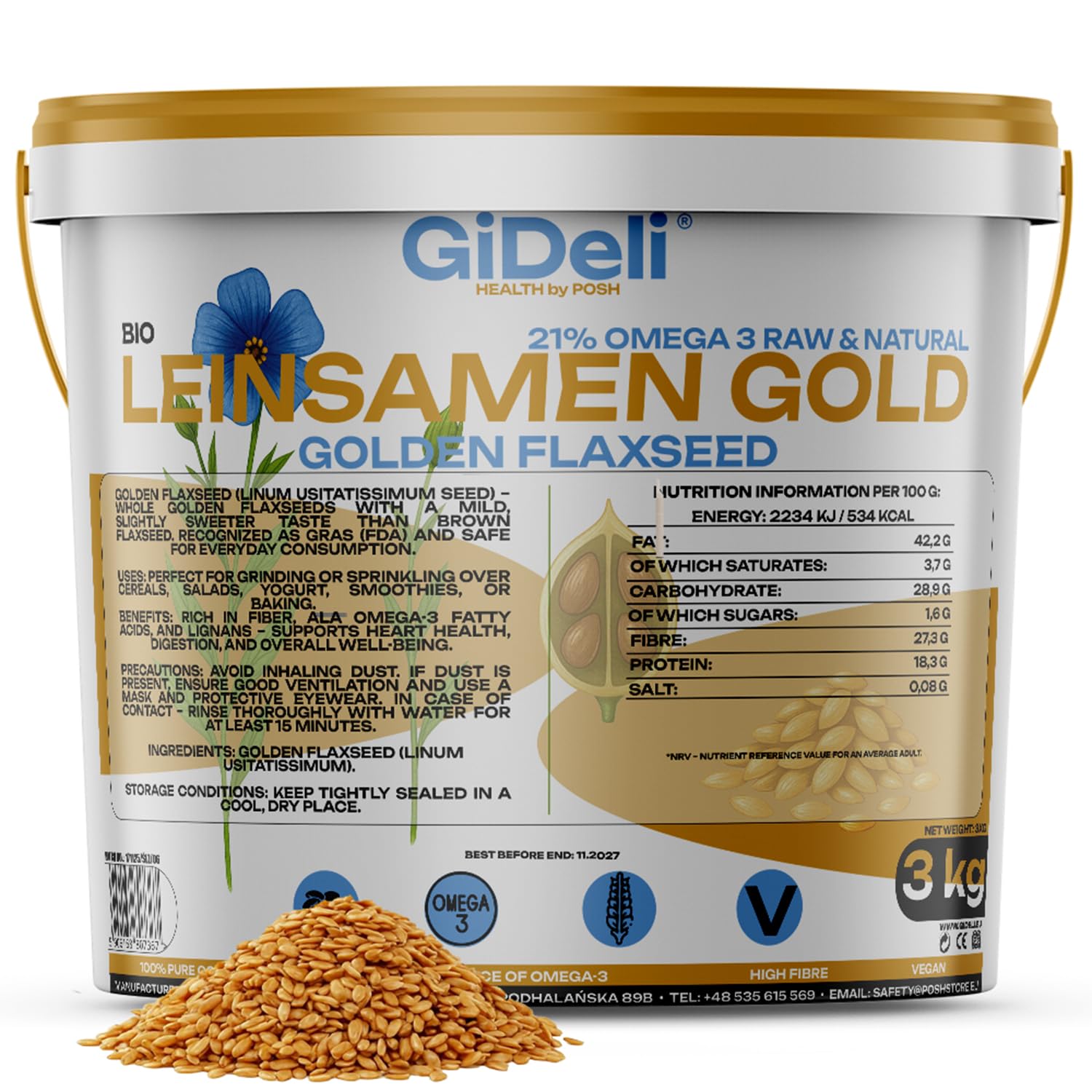 GiDeli Golden Flaxseeds are a premium source of plant-based omega-3 (ALA) and fiber. The whole raw seeds offer a mild, slightly nutty flavor and are ideal for a daily dietary supplement. Use them ground or whole in smoothies, yogurt, cereal, or when baking. Our golden flaxseeds are additive-free, vegan, gluten-free, and ideal for keto or low-carb diets. Packaged in a convenient 3 kg resealable bucket, perfect for high-volume consumers and health-conscious households. INGREDIENTS 100 Golden Flaxseeds (Linum usitatissimum) SAFETY WARNING Safety warning: Keep out of reach of young children. Do not use if you have a known allergy to flaxseeds. Do not exceed the recommended daily intake. Store in a cool, dry place away from light. Close tightly after opening. See more3kg storage container with lid – resealable, protects freshness and makes storage easy. Vegan and gluten-free – suitable for keto, low-carb, and plant-based diets. Versatile: perfect for smoothies, cereals, bread, pastries, or as a salad topping. Rich in omega-3 and fiber – supports digestion, heart health, and cholesterol. 100 golden flax seeds – whole, natural, full of flavor and nutrients.GiDeli Graines de lin dorées 3 kg de graines brutes entières oméga-3 et fibres, idéales pour les smoothies, les céréales, la pâtisserie et les salades (3000 g)DESCRIPTION DU PRODUIT DESCRIPTION DU PRODUIT GiDeli Les graines de lin dorées sont une source de qualité supérieure d'oméga-3 végétaux (ALA) et de fibres. L'ensemble des graines brutes offre une note douce et légèrement noisette et est idéale pour un complément alimentaire quotidien. Utilisez-les moulus ou entiers dans des smoothies, des yaourts, des céréales ou lors de la cuisson. Nos graines de lin dorées sont sans additifs, végétaliennes, sans gluten et idéales pour les régimes céto ou à faible teneur en glucides. Emballé dans un seau refermable pratique de 3 kg, idéal pour les grands consommateurs et les ménages soucieux de leur santé. INGRÉDIENTS 100 graines de lin dorées (Linum usitatissimum) AVERTISSEMENT DE SÉCURITÉ Avertissement de sécurité : tenir hors de portée des jeunes enfants. Ne pas utiliser en cas d'allergie connue aux graines de lin. Ne pas dépasser la quantité journalière recommandée. Conserver dans un endroit sec, frais et à l'abri de la lumière. Bien refermer après ouverture. Voir plusBoîte de conservation de 3 kg avec couvercle – refermable, protège la fraîcheur et facilite le stockage. Végétalien et sans gluten - Convient pour les régimes céto, faible en glucides et végétaux. Polyvalent : parfait pour les smoothies, les céréales, le pain, les pâtisseries ou comme garniture pour les salades. Riche en oméga-3 et en fibres - Favorise la digestion, la santé cardiaque et le cholestérol. 100 graines de lin dorées - Non moulues, naturelles, riches en goût et en nutriments.