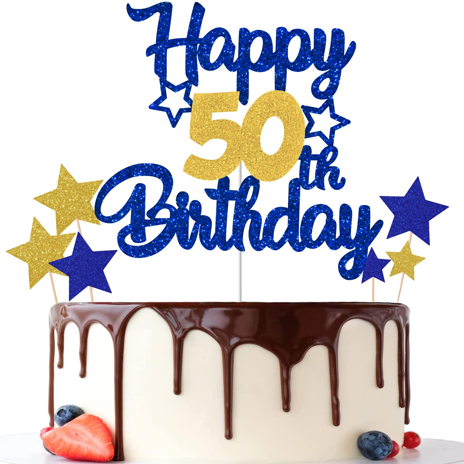 Gidobo 50th Birthday Cake Toppers Blue Gold Glittery Cake Decorations with Stars Fifty Years Old Birthday Party Supplies for Men and Women Blue&gold 50th
