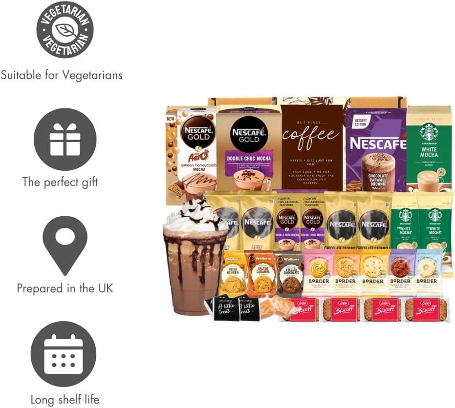 • CHOCOLATE COFFEE GIFT SET - Perfect for Fathers Day! Includes Nescafe Golden Honeycomb Aero Sachets, Nescafe Chocolate Caramel Brownie Mocha Sachets, Nescafe Double Chocolate Mocha Sachets, Starbucks White Mocha Sachets, Walkers Twin Pack Biscuits, Border Biscuits, Milk Chocolates, Clotted Cream Fudge and Lotus Biscuits. This is a Coffee Hamper gift set that will absolutely delight your friends, family or work colleagues.