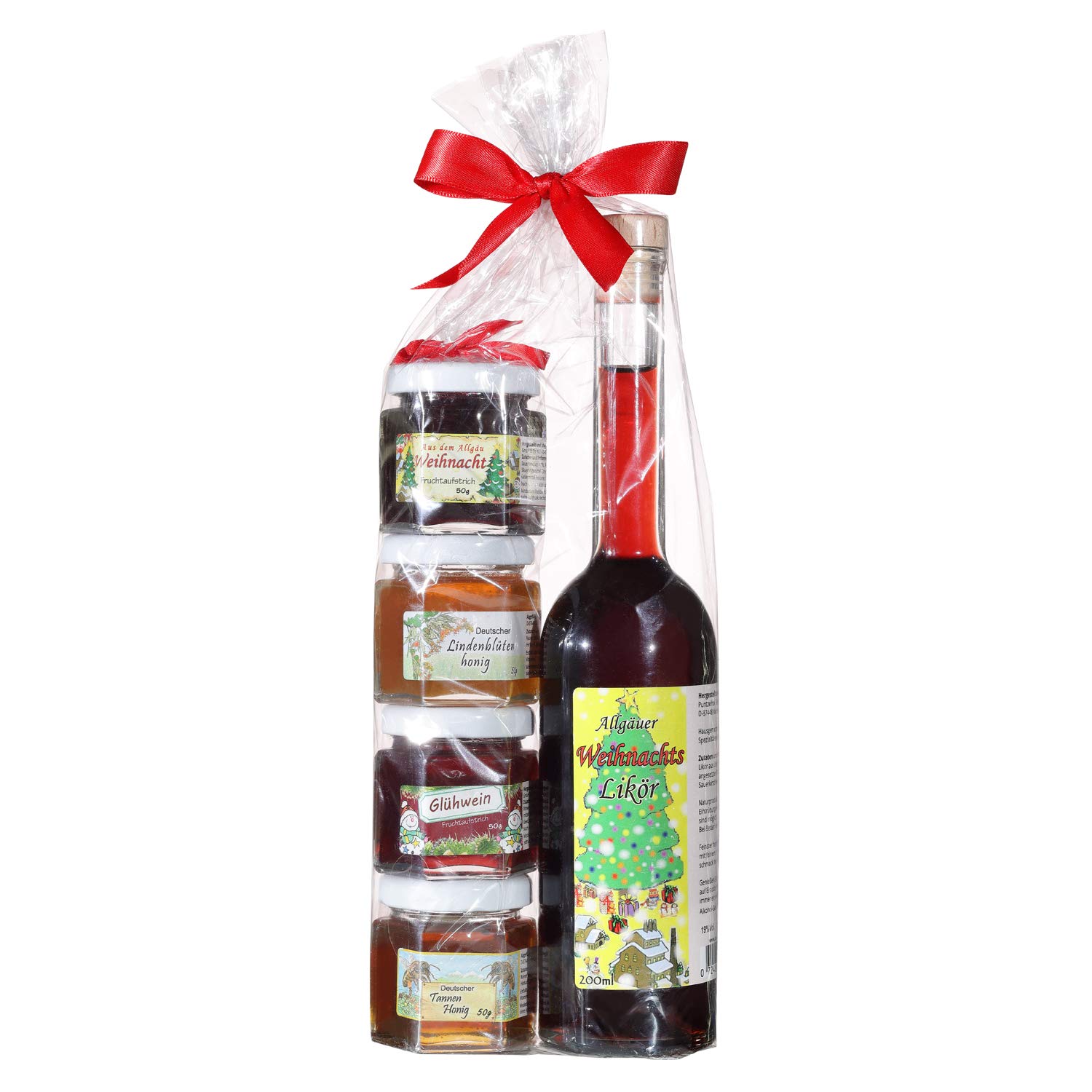 Geschenkset aus dem Allgäu 200ml Weihnachtslikör aus ausgewählten Früchten Fruchtaufstriche-Honig Weihnachts Geschenkset Handgemachte Fruchtaufstriche Garantiert Deutscher Honig (200ml 4x50g)
