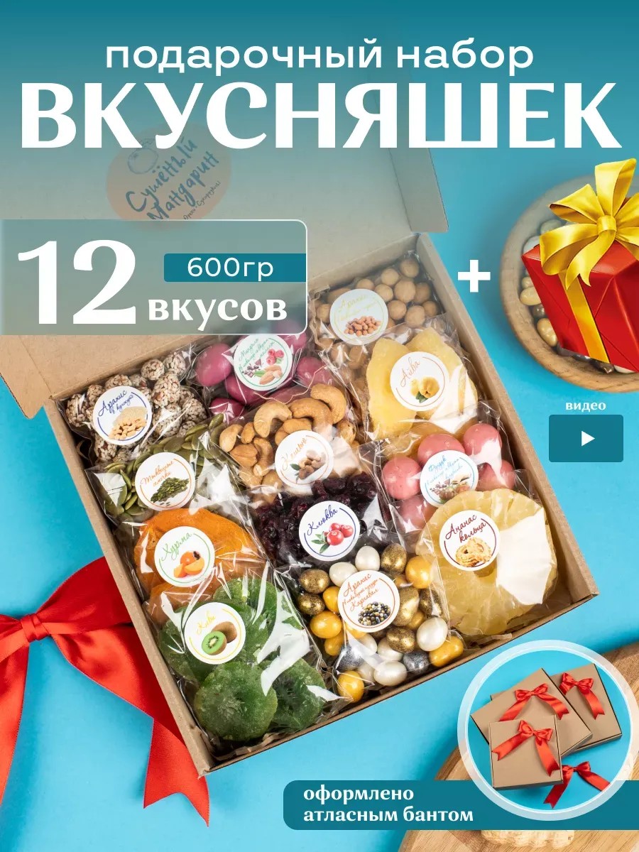 gift set of nuts and dried fruits is a wonderful gift that will impress everyone, as these treats are loved by all ages. This original gift box of sweets contains 12 types of dried fruits and nuts. Each flavor is individually wrapped. This delicious gift is perfect for satisfying hunger and also helps boost immunity. This gift set for February 14th, 23rd, and March 8th is filled with vitamins, minerals, and microelements, which are especially necessary during the cold season. With its bright colors, this sweet set will create a positive mood not only for children but also for adults. This original gift is appropriate for any holiday for mom, sister, colleague, friend, or teacher. This sweet gift set will make a wonderful table decoration and a wonderful complement as a dessert to coffee or tea. This ideal gift is suitable for those who want to surprise with delicious treats and give the gift of goodness and attention. This original set contains: 12 types of nuts, dried fruits and sweets.