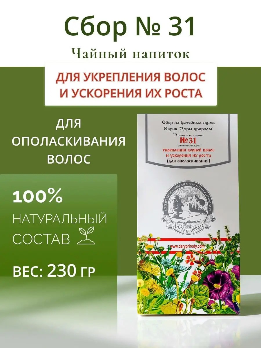 Травяной сбор № 31 ускоряет рост волос, укрепляет корни. Применяется сбор наружно, для ополаскивания волос.