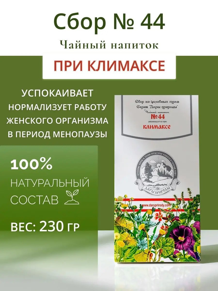 равяной сбор женский № 44 - это натуральный фиточай, специально созданный для поддержки женского организма в период климакса и менопаузы. Этот уникальный травяной сбор включает в себя тщательно подобранные травы, которые помогают облегчить симптомы, связанные с изменениями гормонального фона.