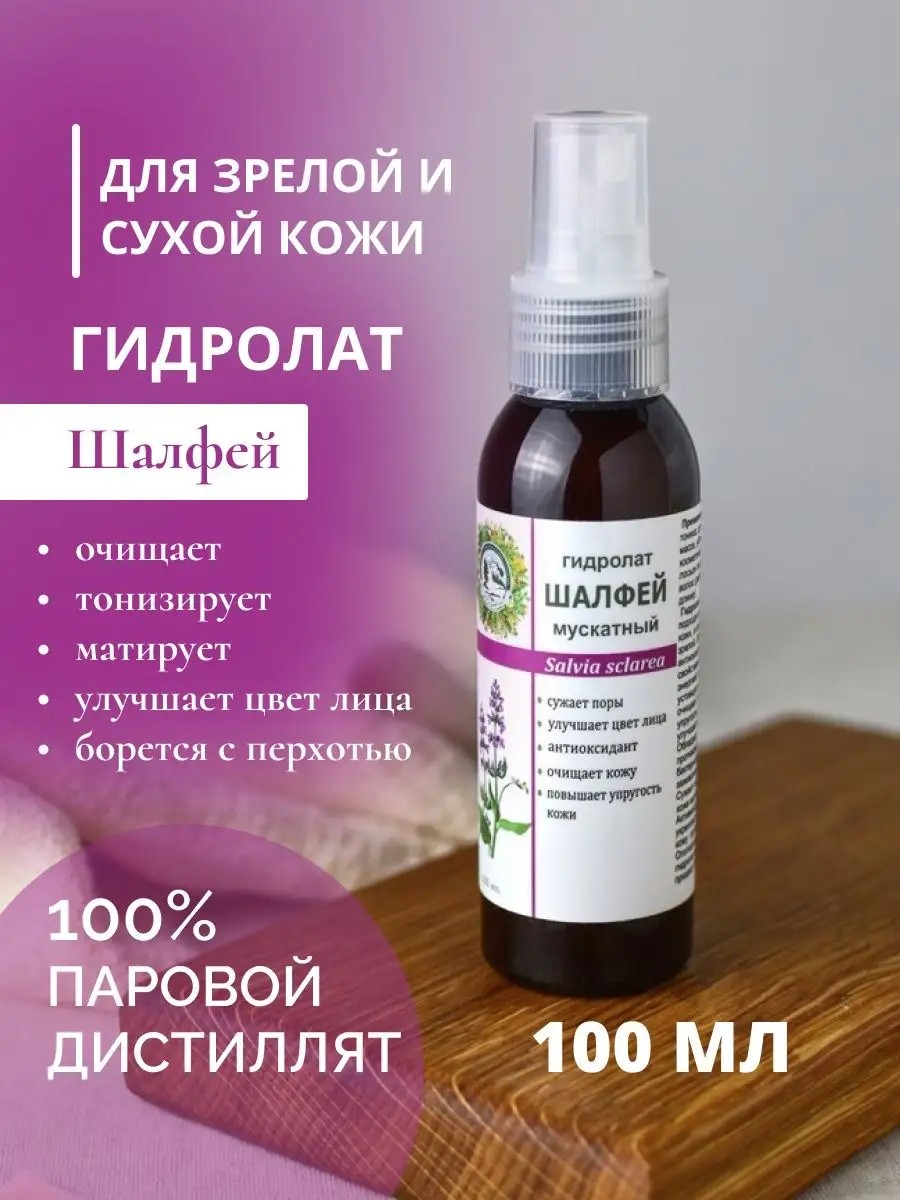 Гидролат шалфей мускатный подходит для всех типов кожи, особенно для зрелой кожи. Гидролат шалфей обладает антиоксидантным свойством, омолаживает, наполняет энергией возрастную, уставшую кожу. Гидролат шалфея мягко очищает кожу, повышает упругость кожи, тонизирует, освежает и улучшает цвет лица. Гидролат обладает противовоспалительным, бактерицидным и заживляющим действием, сужает поры, придает коже матовость, можно использовать шалфейный гидролат для лица и для ухода вокруг глаз. Гидролат шалфея используется как спрей от прыщей на теле, как отшелушивающий тоник для лица и как средство для борьбы с несовершенствами кожи.