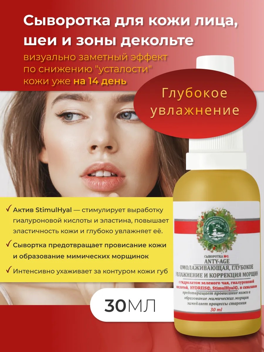 Гиалуроновая сыворотка от морщин обладает омолаживающим эффектом за счёт глубокого увлажнения кожи. Активные компоненты сыворотки против старения в составе натуральной сыворотки от морщин вокруг глаз, гусиных лапок, способны проникать даже в самые глубокие слои кожи и удерживать влагу как внутри клетки, так и на ее поверхности.