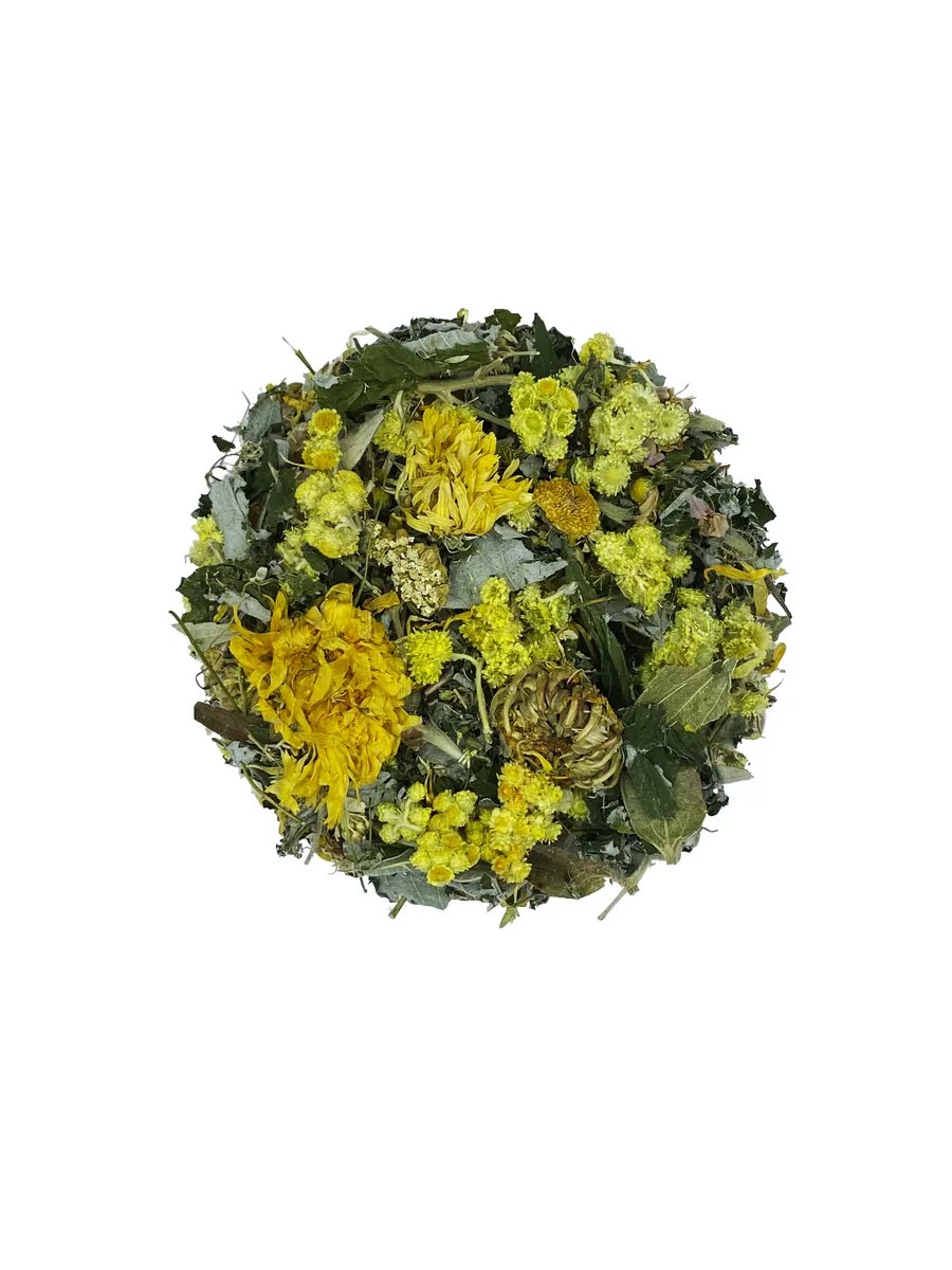 Состав сбора: ромашка. репяшок, календула. лист подорожника. бессмертник. тысячелистник. зопник. мята. овес молочной спелости. семена льна. фенхеля и укропа.