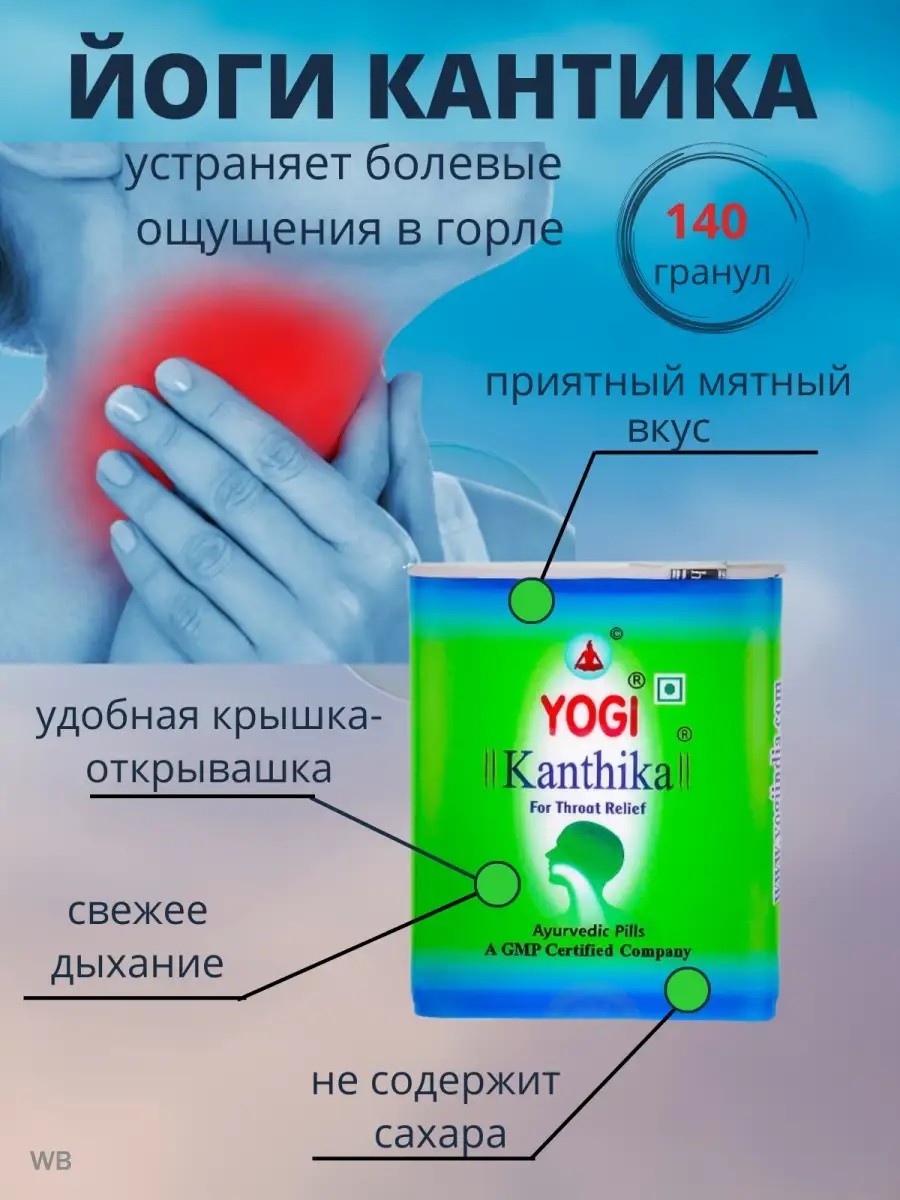 Yogi Kantika is a natural Ayurvedic remedy for sore throat and fresh breath. It effectively and quickly eases breathing. Immediately after taking it, the timbre of the voice improves due to softening of the vocal cords. Contains no sugar, artificial colors, or other chemical additives. These Ayurvedic lozenges will help effectively cope with cough, hoarseness, and a sore throat, eliminating inflammation, irritation, swelling, and pain in the throat. In addition, Yogi Kantika provides long-lasting relief from bad breath. The drug is recommended for use at the first signs of a cold, runny nose, dry and productive cough, a sore and dry throat, hoarseness in singers, a sore throat, and difficulty swallowing. Instructions for use: dissolve 2-3 granules 5-6 times a day. Indication: colds and runny nose; tonsillitis; sore throat; upper respiratory tract infection; hoarseness; acute laryngitis; dry cough; flu.