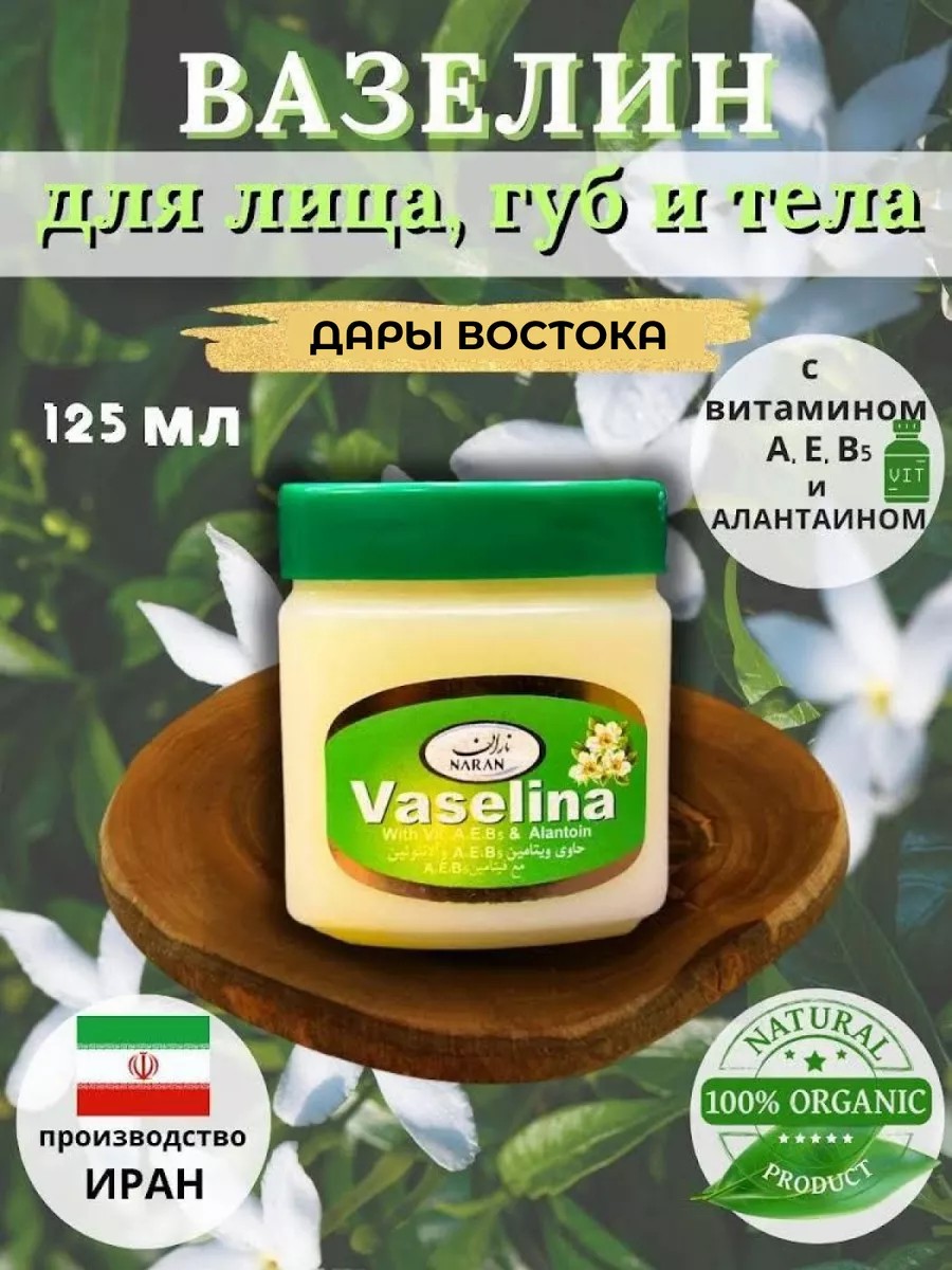 Вазелин 125мл. с витаминным комплексом и пчелиным воском. Вазелиновое масло с содержанием витаминов А, D3, Е. Витамин А - необходим для роста новых клеток, замедляет процесс старения. Витамин D3- улучшает клеточное питание. Витамин Е - Способствует улучшению цвета кожи лица, выводя токсины, очищая организм и увеличивая жизнь эритроцитам, красным кровяным тельцам, действуя как профилактическое средство против анемии (малокровия). Крем осветляет нежную и тонкую кожу и обладает антибактериальными свойствами, предупреждая дерматологические проблемы эпидермиса. Имеет способность сглаживать шрамы и рубцы, питает и укрепляет дерму. Борется не только с возрастными изменениями, но и блокирует появление новых пятен.
