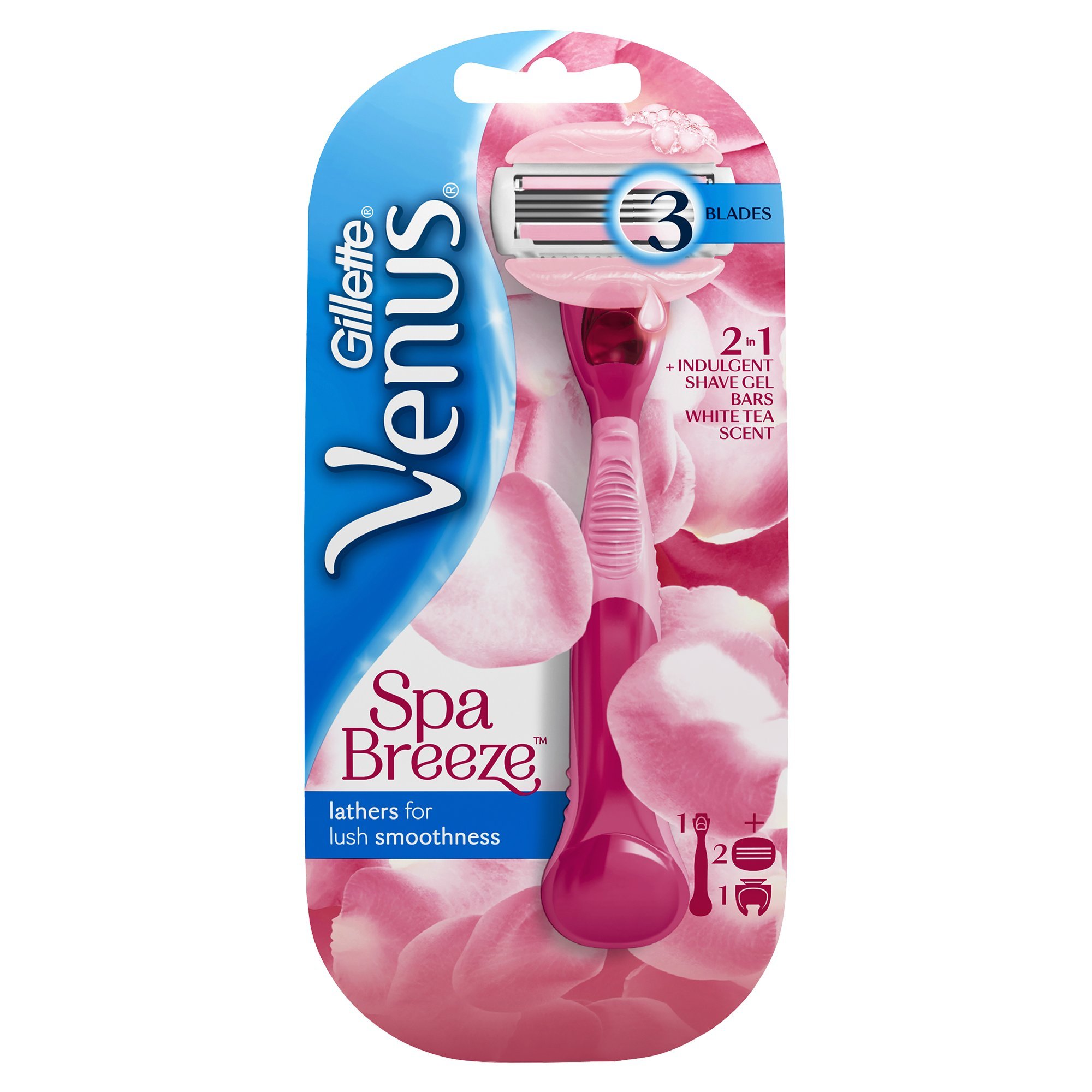 Give your skin the love it deserves with the Gillette Venus ComfortGlide Spa Breeze women's razor in a refreshing white tea scent. Specially designed for your unique skin. The SkinCushion lubricating strip helps protect against shaving irritation. Flexible gel cushions adapt to the contours of your body. The 3-blade shaving head glides smoothly over your skin and helps protect against razor irritation after shaving. Keep the handpiece, change only the blade: our ergonomic, non-slip handle ensures greater precision. All Venus replacement blades fit all Venus handpieces (except Simply Venus and Venus Intimate).