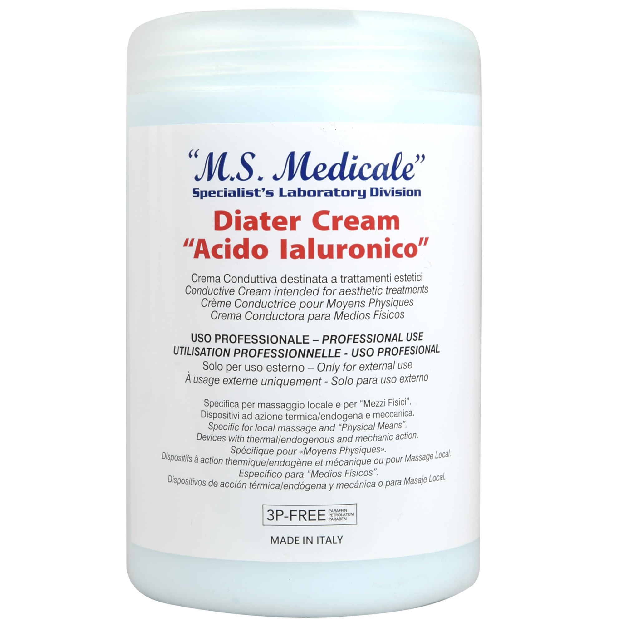 Gima Conductive Diater Cream with hyaluronic acid is an ideal cream for musculoskeletal therapies. It contributes to the functional recovery of athletes and to aesthetic treatments of the epidermis and dermis. It allows for highly effective enhancement of therapies concentrated on the treated tissue area. For professional use only in various fields: physiotherapy, physiatry, plastic surgery, aesthetics, orthodermic therapy, athletic training, massage, and podiatry. The cream is contained in a heat- and light-protected PET container with a cap and inner cap. Its paraben- and petrolatum-free formula is rich in active ingredients and provides moisturizing and tissue protection.A formula rich in active ingredients that provides hydration and protection for tissues, free of parabens and petrolatum. For professional use only in various fields: physiotherapy, physiatry, plastic surgery, aesthetics, orthodermic therapy, athletic training, massage, and podiatry. It enhances therapies concentrated on the treated tissue area with high efficacy. It contributes to the functional recovery of athletes and to aesthetic treatments of the epidermis and dermis. This hyaluronic acid-conducive cream is ideal for musculoskeletal therapies.GIMA - Crème Conductive Diater hydratante protectrice, avec de l'acide hyaluronique pour l'amélioration des thérapies musculo-squelettiques et tecar, pour usage professionnel, 1 litre, 28347DESCRIPTION DU PRODUIT Gima Crème Conductive Diater à l'acide hyaluronique est une crème idéale pour les thérapies musquelettiques. Contribue à la récupération fonctionnelle des athlètes et aux traitements esthétiques de l'épiderme et du derme. Permet de renforcer les thérapies concentrées sur la portion de tissu traité avec une efficacité élevée. Usage professionnel uniquement dans différents domaines : physiothérapie, physiatrie, chirurgie plastique, esthétique, thérapie orthodermique, préparation athlétique, massage et podologie. La crème est contenue dans un récipient en PET thermoprotégé et photoprotégé, avec bouchon et sous-bouchon. Sa formule sans parabène ni pétrolate est riche en ingrédients actifs et joue une fonction hydratante et protectrice pour les tissus.Formule riche en ingrédients actifs qui joue une fonction hydratante et protectrice pour les tissus, sans parabène ou pétrolates. Usage professionnel uniquement dans différents domaines : physiothérapie, physiatrie, chirurgie plastique, esthétique, thérapie orthodermique, préparation athlétique, massage et podologie. Permet de renforcer les thérapies concentrées sur la portion de tissu traité avec une efficacité élevée. Contribue à la récupération fonctionnelle des athlètes et aux traitements esthétiques de l'épiderme et du derme. Crème conductrice à l'acide hyaluronique idéale pour les thérapies musqueletriques.