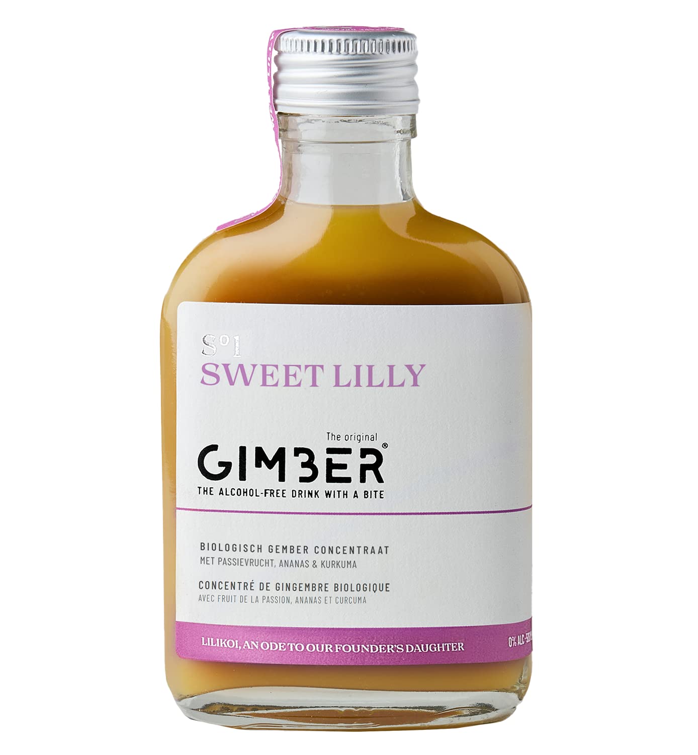 GIMBER: With this Belgian drink, you will experience the powerful taste of Gimber. A versatile organic ginger drink that will make your taste buds dance, with or without alcohol. 100 ORGANIC: The refreshing Gimber concentrate is made entirely of organic and natural ingredients. Gimber has an organic certification (NL-BIO-01) EU non-EU agriculture. PREPARATION: The possibilities with Gimber are endless! Our standard recipe: mix 20-30ml of Gimber with fresh sparkling water. Enjoy your non-alcoholic drink without further delay!. INGREDIENTS: This delicious concentrate is made of high-quality organic ingredients. 33 ginger , cane sugar , passion fruit , water, pineapple , lemon , turmeric ( organic origin). GIMBER S 1 SWEET LILLY: A special GIMBER edition, enjoy this alcohol-free tropical blend of ginger this summer combined with the sweetness of passion fruit, pineapple and turmeric.GIMBER : Avec cette boisson belge, vous ferez l'expérience du goût puissant du Gimber. Une boisson biologique polyvalente à base de gingembre qui fera danser vos papilles, avec ou sans alcool. 100 BIOLOGIQUE : Le concentré rafraîchissant Gimber est entièrement composé d'ingrédients biologiques et naturels. Gimber dispose d'une certification biologique (NL-BIO-01) Agriculture UE non UE. PRÉPARATION : Les possibilités avec Gimber sont infinies ! Notre recette standard : mélangez 20-30ml de Gimber avec de l'eau pétillante fraîche. Déguster votre boisson sans alcool sans plus attendre !. INGREDIENTS : Ce délicieux concentré est composé d'ingrédients biologiques de haute qualité. 33 gingembre , sucre de canne , fruit de la passion , eau, ananas , citron , curcuma ( origine biologique). GIMBER S 1 SWEET LILLY : Une édition spéciale GIMBER, profitez de ce mélange tropical sans alcool de gingembre cet été combiné avec la douceur du fruit de la passion, de l'ananas et du curcuma.