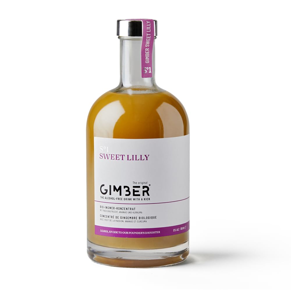 Gimber: With this Belgian drink, you will experience the powerful taste of Gimber. A versatile organic ginger drink that will make your taste buds dance, with or without alcohol. 100 ORGANIC: The refreshing Gimber concentrate is made entirely of organic and natural ingredients. Gimber has an organic certification (NL-BIO-01) EU non-EU agriculture. PREPARATION: The possibilities with Gimber are endless! Our standard recipe: mix 20-30ml of Gimber with fresh sparkling water. Enjoy your non-alcoholic drink without further delay!. INGREDIENTS: This delicious concentrate is made of high-quality organic ingredients. 33 ginger, cane sugar, passion fruit, water, pineapple, lemon, turmeric (organic origin). Gimber S 1 SWEET LILLY. A special edition of Ginger, enjoy this non-alcoholic tropical blend of ginger this summer combined with the sweetness of passion fruit, pineapple, and turmeric.Gimber : Avec cette boisson belge, vous ferez l'expérience du goût puissant du Gimber. Une boisson biologique polyvalente à base de gingembre qui fera danser vos papilles, avec ou sans alcool. 100 BIOLOGIQUE : Le concentré rafraîchissant Gimber est entièrement composé d'ingrédients biologiques et naturels. Gimber dispose d'une certification biologique (NL-BIO-01) Agriculture UE non UE. PRÉPARATION : Les possibilités avec Gimber sont infinies ! Notre recette standard : mélangez 20-30ml de Gimber avec de l'eau pétillante fraîche. Déguster votre boisson sans alcool sans plus attendre !. INGREDIENTS : Ce délicieux concentré est composé d'ingrédients biologiques de haute qualité. 33 gingembre, sucre de canne, fruit de la passion, eau, ananas, citron, curcuma (origine biologique). Gimber S 1 SWEET LILLY. Une édition spéciale Gimber, profitez de ce mélange tropical sans alcool de gingembre cet été combiné avec la douceur du fruit de la passion, de l'ananas et du curcuma.