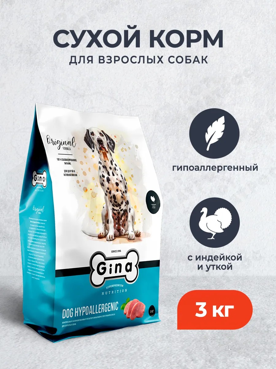 Gina Dog Hypoallergenic сухой гипоаллергенный корм для взрослых собак с индейкой и уткой - 3 кг. Dog Hypoallergenic Комплексный сбалансированный гипоаллергенный корм супер премиум класса для взрослых собак. Корм изготовлен только из натуральных высококачественных продуктов с добавлением минеральных веществ и витаминов. Этот рацион не имеет в своём составе пшеницу, сою, куриное мясо, свинину и говядину, что избавляет корм от широко распространённых аллергенов. Ингредиенты: обезвоженное мясо индейки (15%), утки (10%) и тунца (10%), рис (20%), кукуруза, птичий жир, растительные масла холодного отжима, рыбий жир, льняное семя, свекловичная стружка, пивные дрожжи, гидролизованная печень, сушёные яблоки, цикорий, лецитин. Другие: Витамин А 18000 IU, витамин D3 1800 IU, Омега-6, Омега-3. Витамино-минеральный состав: витамины А, D,Е, фолиевая кислота, витамины группы В, пантотенат кальция, биотин, железо, медь, цинк, марганец, селен, йод и др. Процентное содержание: сырой белок 28%, сырой жир 18%, сырая клетчатка 2,5%, сырая зола 6,3%, влажность 9%, кальций 1,2%, фосфор 0,9%. Энергетическая ценность: 3776 Ккал/кг