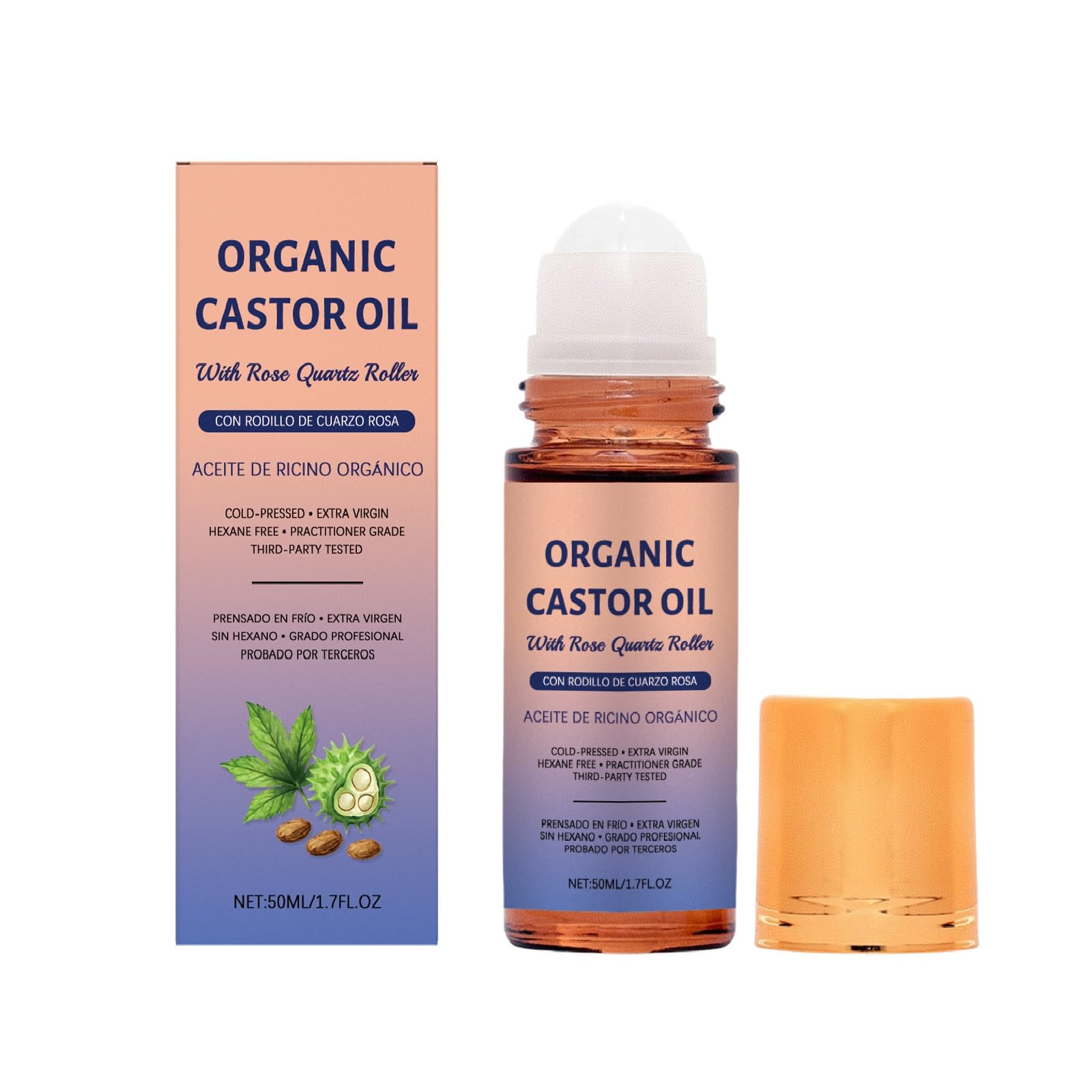 Ginaday Organic Castor Oil with Rose Quartz Quartz Roller Cold-Pressed Pure Castor Oil Roll-On for Skin & Hair Care Hexane-Free. 1.7 Fl Oz