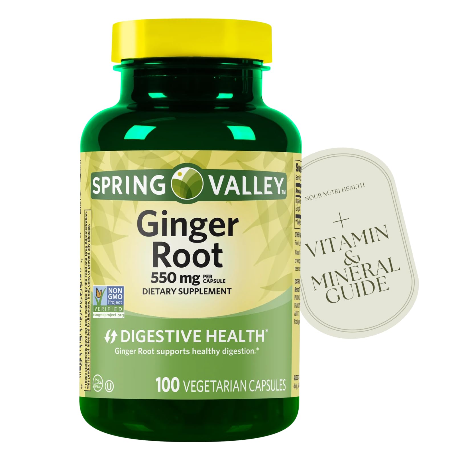 Ginger Root Capsules 550 mg 100 Count (1 Bottle) + Vitamin Guide & Sticker Included
